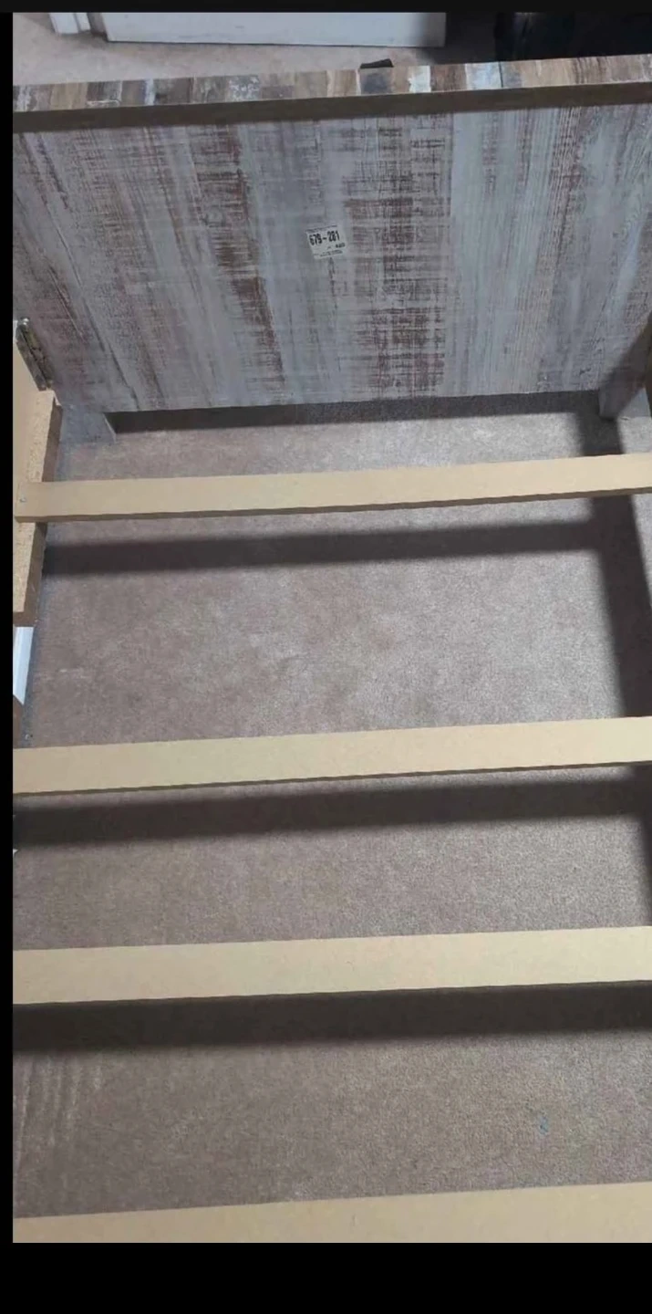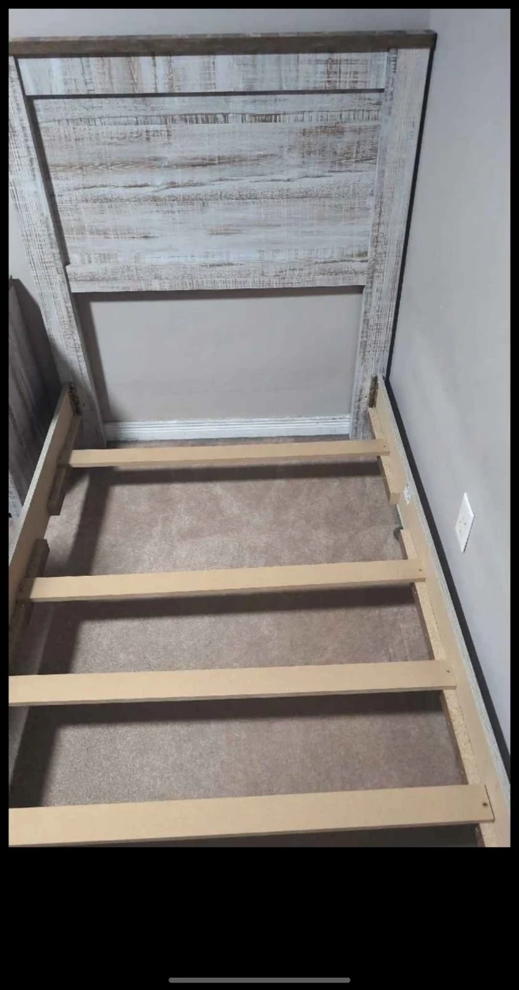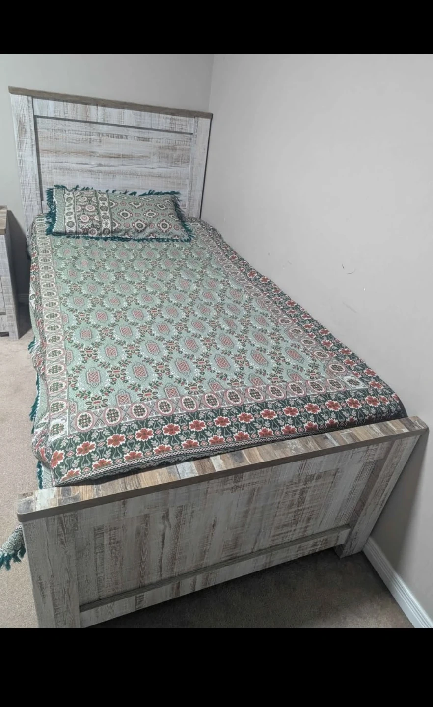 This twin bed frame features a rustic farmhouse design with a distressed wood-look finish. It includes a headboard and a sturdy slat support system for your mattress. Ready for a new bedroom! Box included.