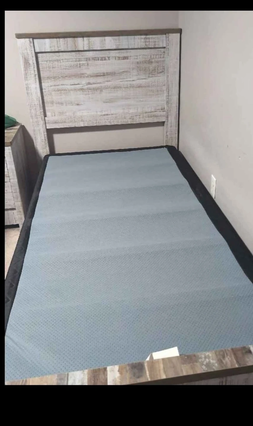 This twin bed frame features a rustic farmhouse design with a distressed wood-look finish. It includes a headboard and a sturdy slat support system for your mattress. Ready for a new bedroom! Box included.