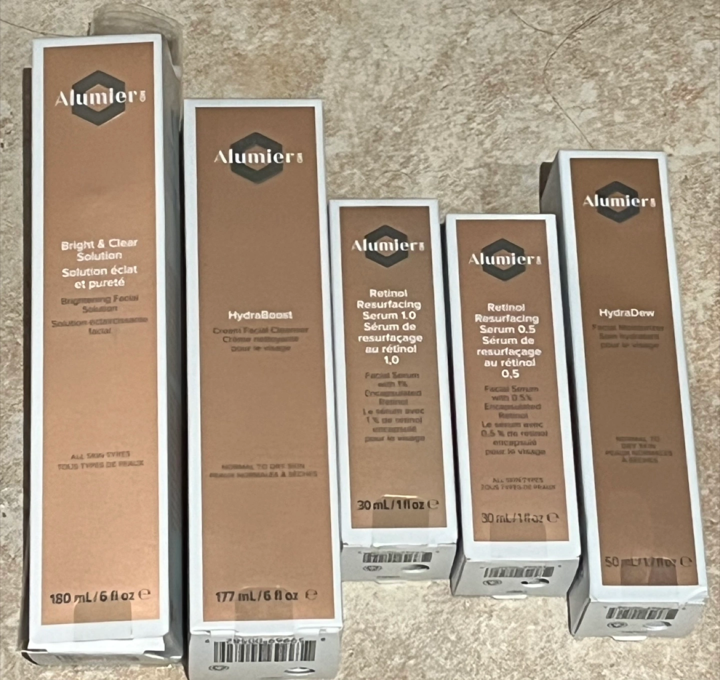 Selling a set of AlumierMD skincare products! Includes: Bright & Clear Solution (180mL), HydraBoost Cream Facial Cleanser (177mL), Retinol Resurfacing Serum 1.0 (30mL), Retinol Resurfacing Serum 0.5 (30mL), and HydraDew Facial Moisturizer (50mL)