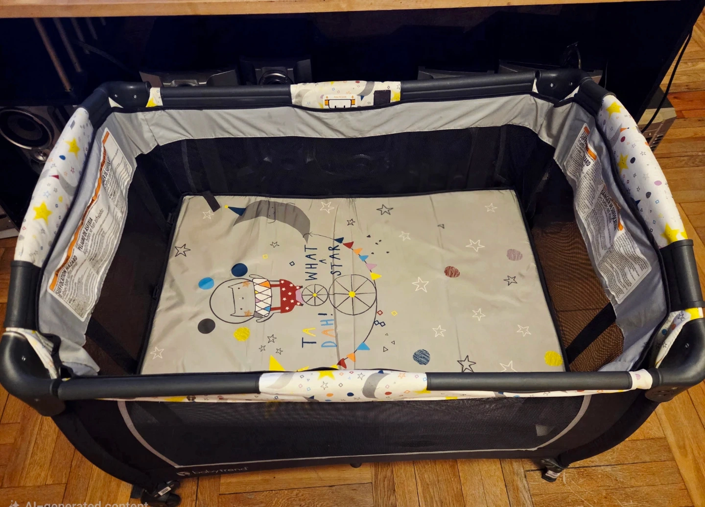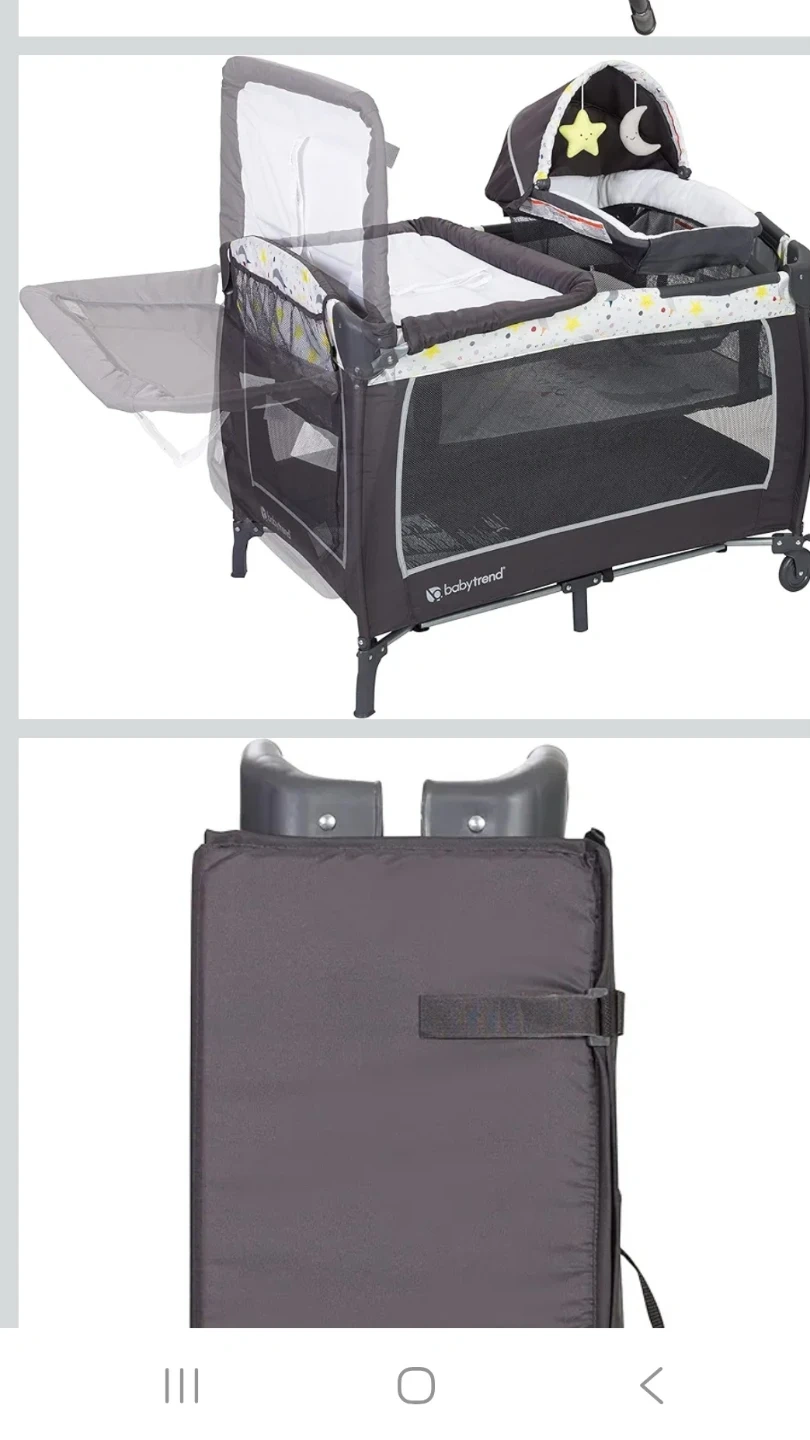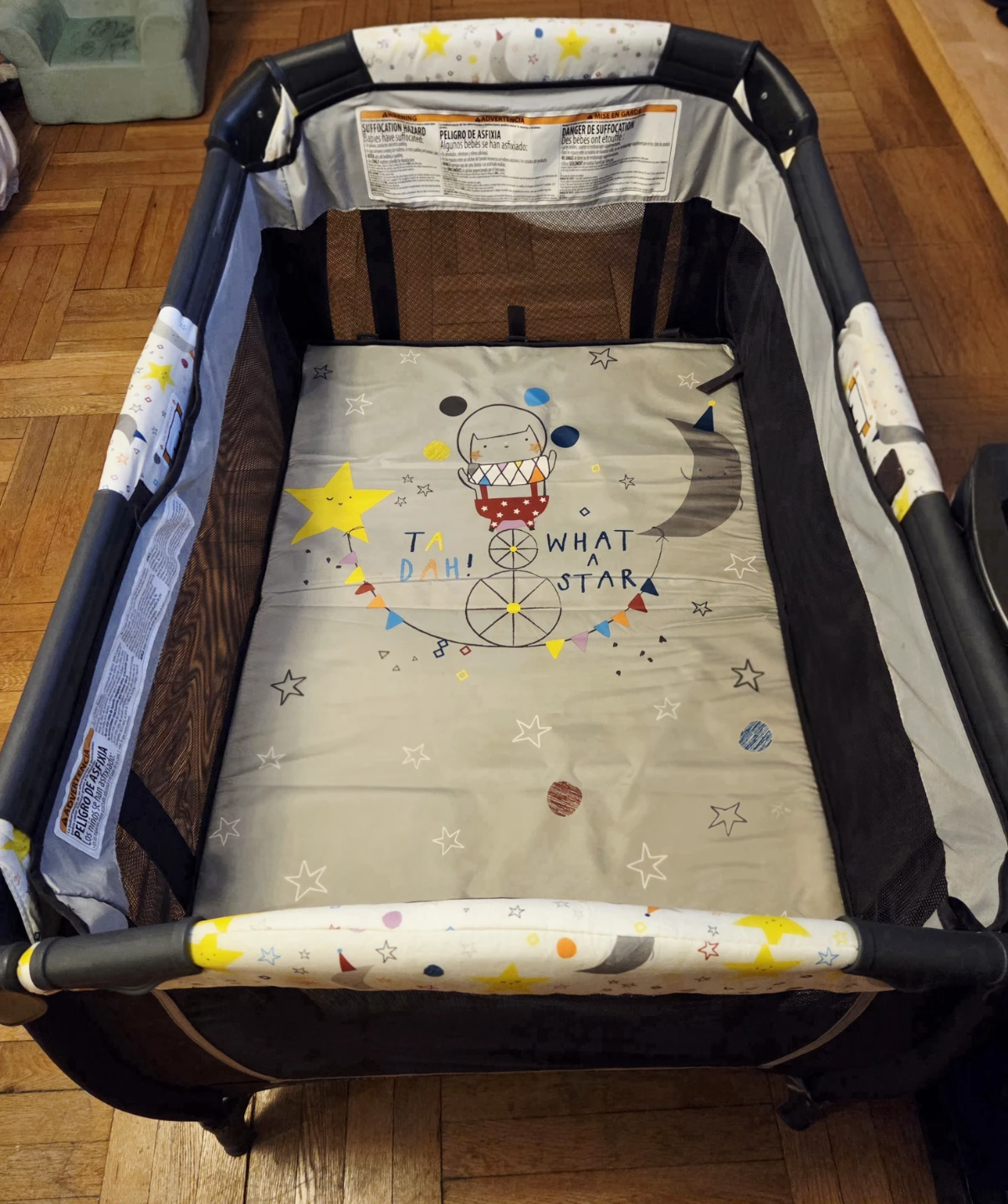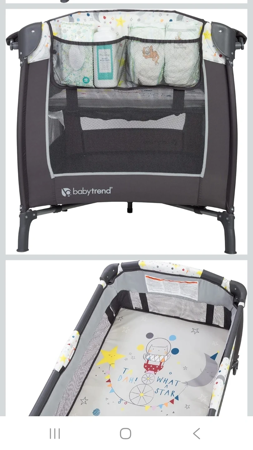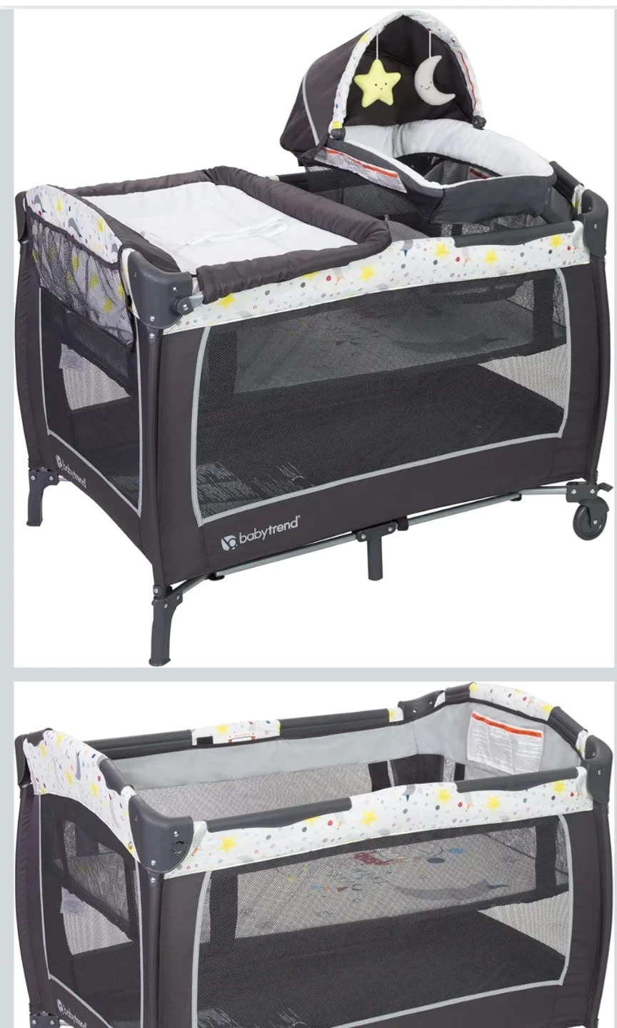 This is a Baby Trend playard. It's dark gray with a star and moon theme on the lining. It includes a changing station and a bassinet attachment with a mobile. The side pockets are great for storing essentials!