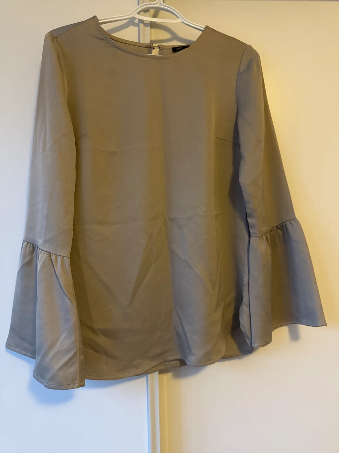 Selling a Dex New York blouse with bell sleeves. It's a size small and in great condition! The colour is a neutral, light brown/grey.