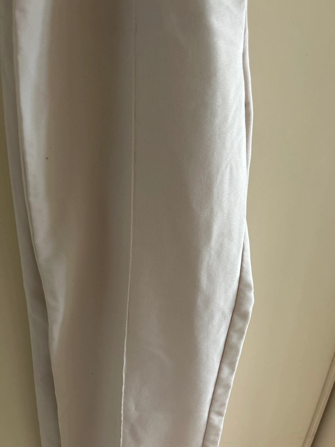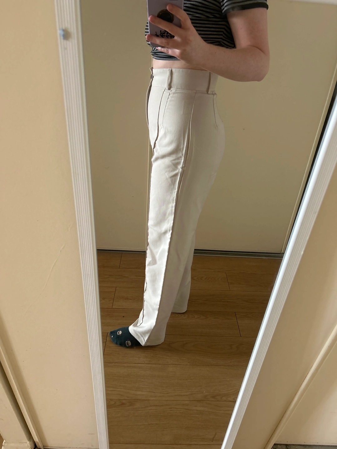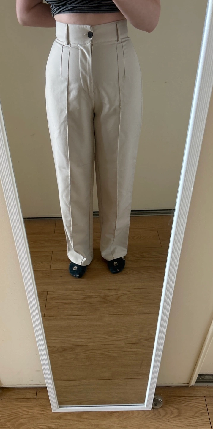 Beige coloured trousers. Features a high waist. Straight leg design and a nice hem down the middle. Pockets on the side. Suitable for work too.
