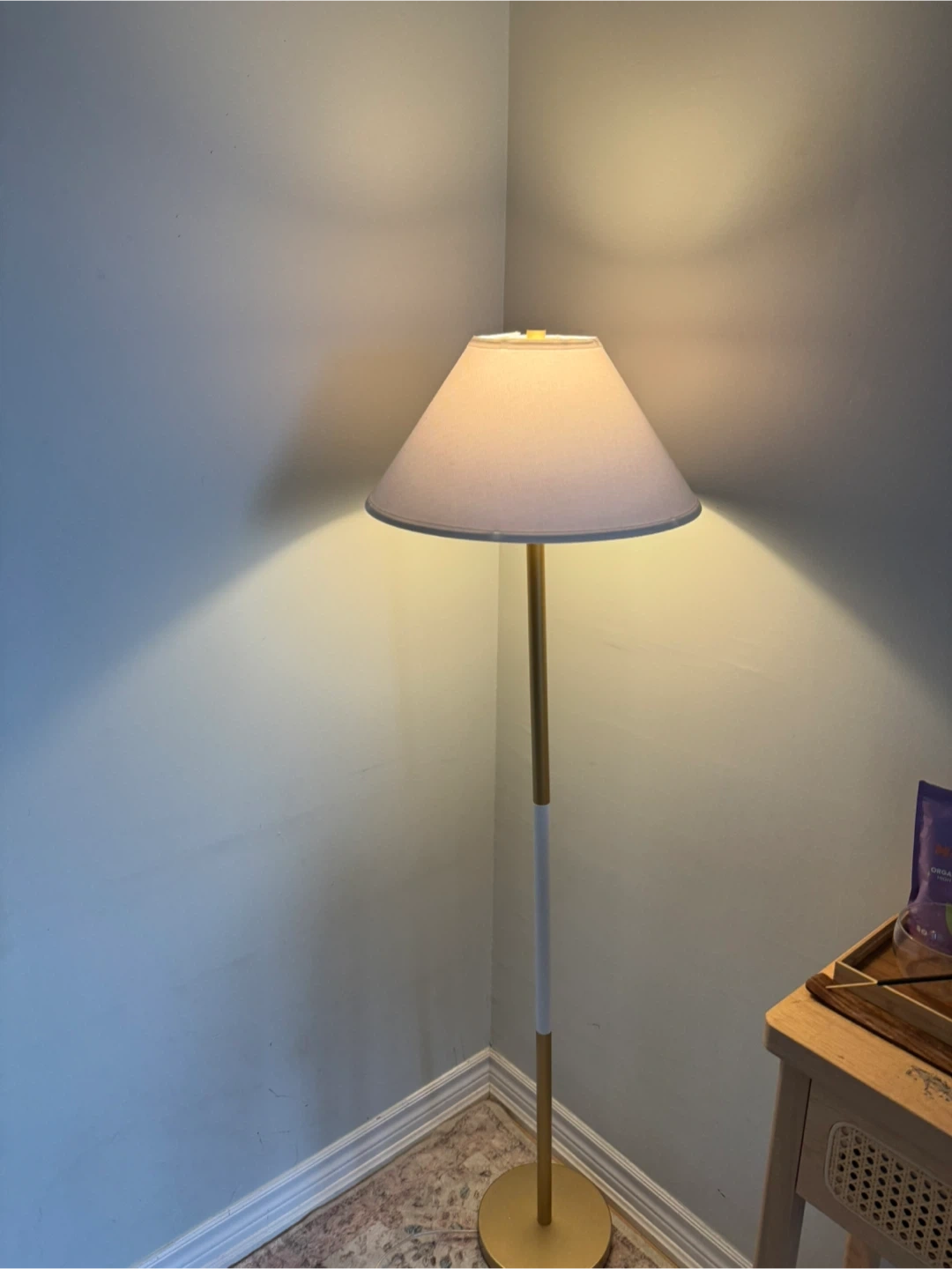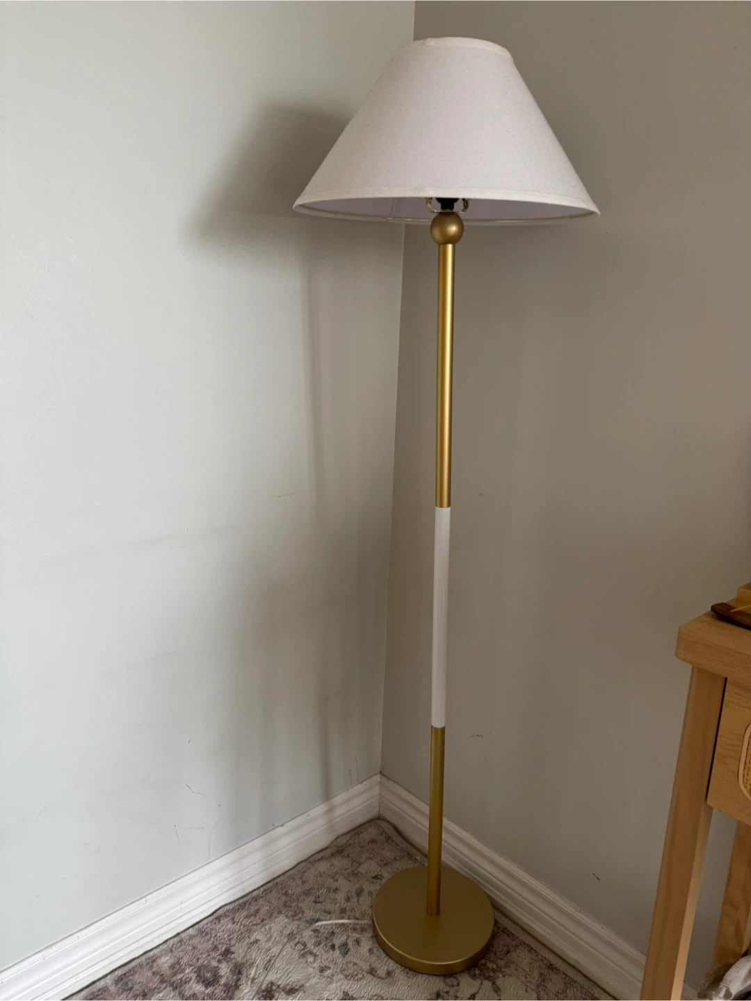 Add a touch of elegance to any room with this stylish floor lamp! It features a gold-tone base with a white accent and a classic lampshade. Perfect for creating a warm and inviting atmosphere in your home
