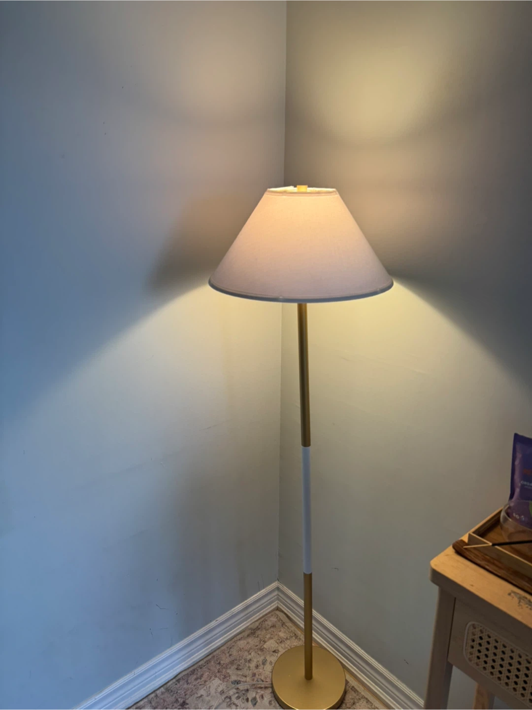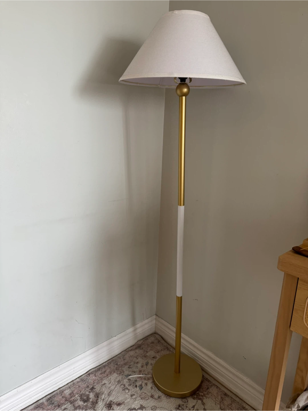 Add a touch of elegance to any room with this stylish floor lamp! It features a gold-tone base with a white accent and a classic lampshade. Perfect for creating a warm and inviting atmosphere in your home