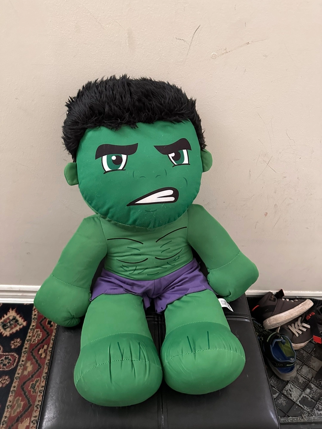 Giant Hulk plush. Green, large, and huggable. Purple shorts. Great for kids or collectors.