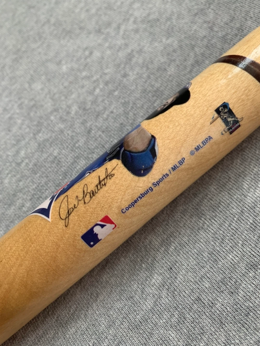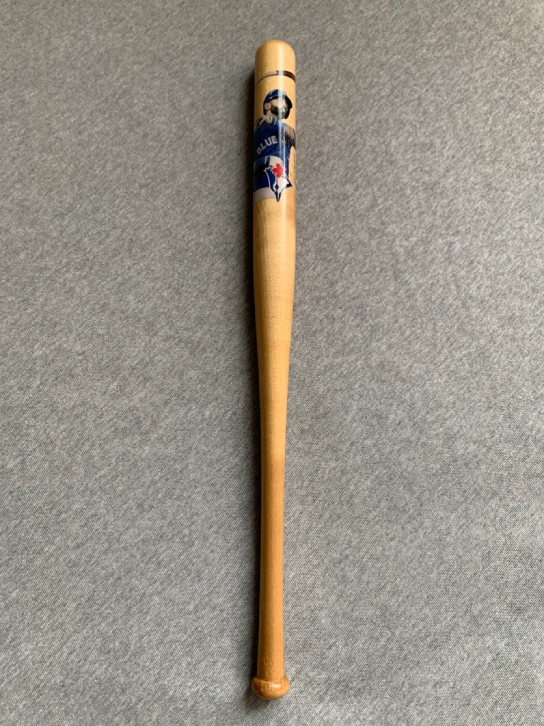 Mini Louisville slugger featuring picture, stamped signature and the Toronto Blue Jays logo.