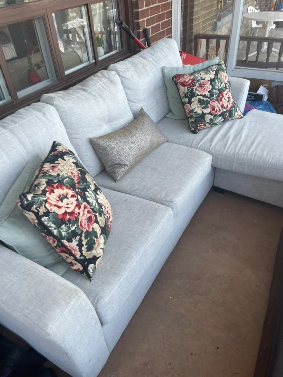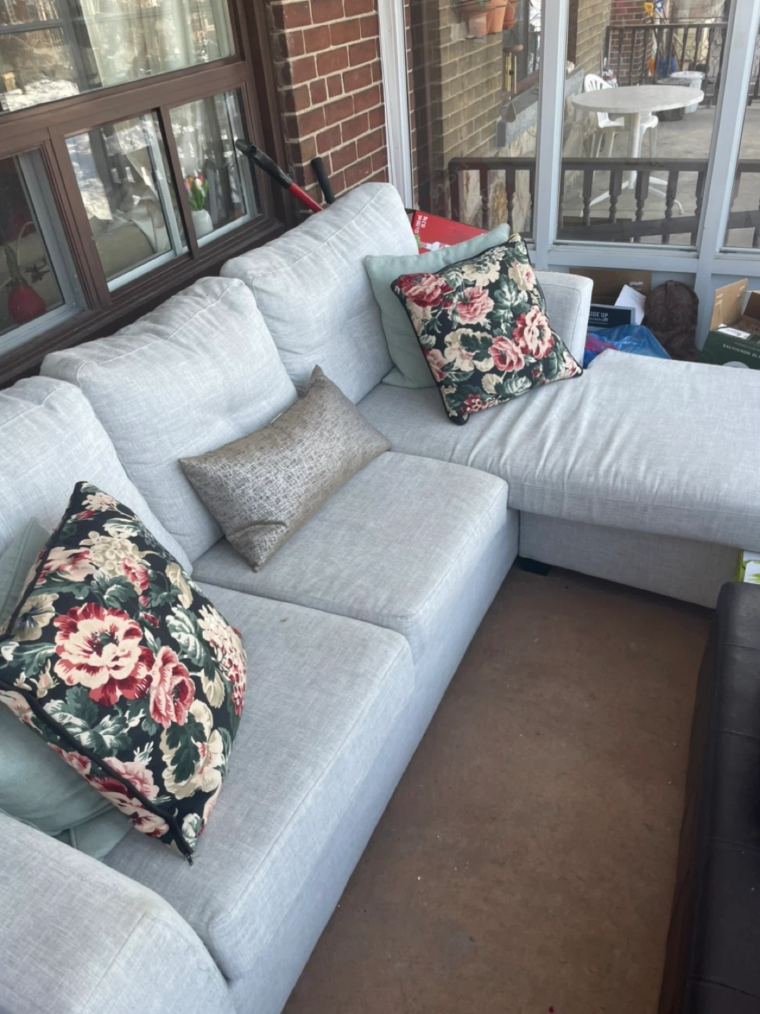 Comfortable sectional sofa with a chaise lounge. Upholstered in a light grey fabric. Comes with accent pillows for added style and comfort. Its neutral colour makes it a versatile addition to any living space. Wonderful memories but time to go to someone else’s home.