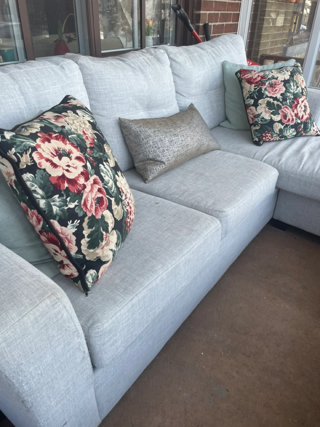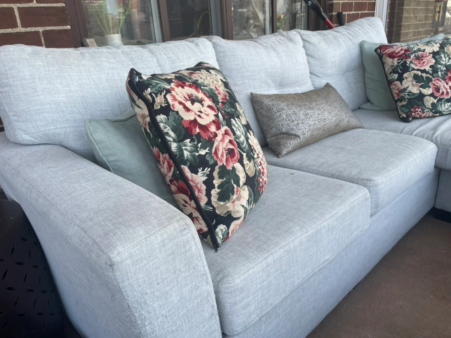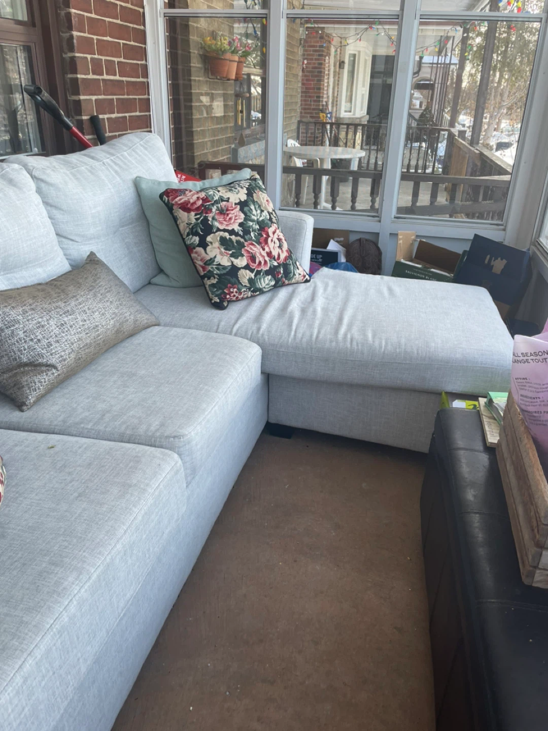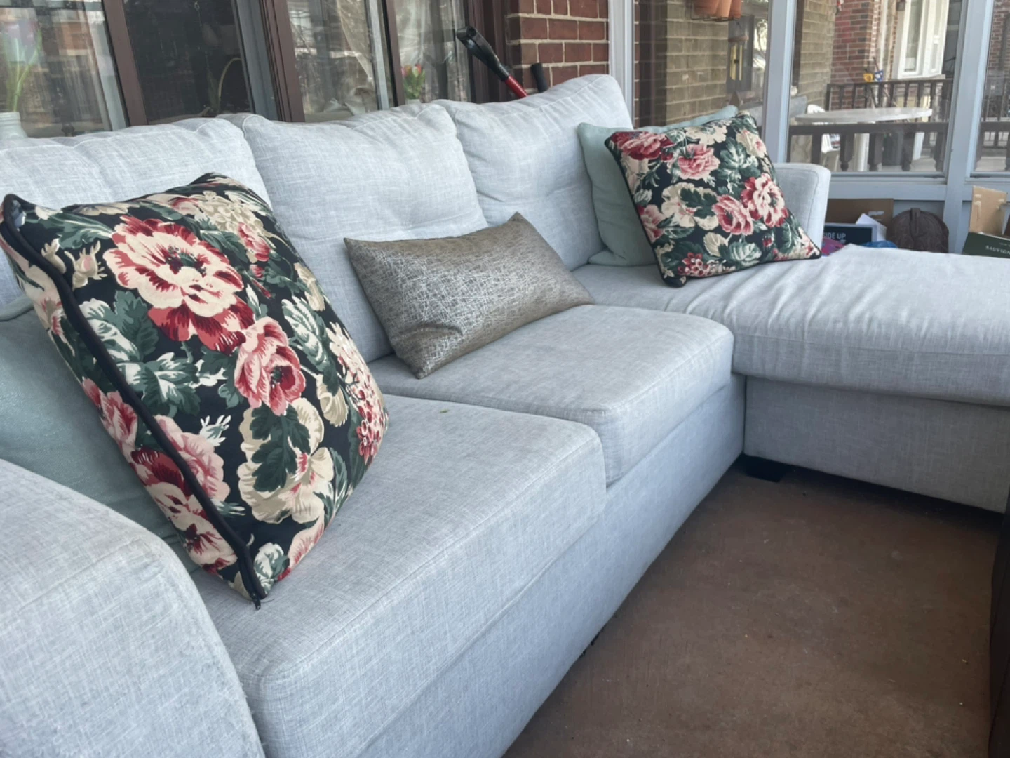 Comfortable sectional sofa with a chaise lounge. Upholstered in a light grey fabric. Comes with accent pillows for added style and comfort. Its neutral colour makes it a versatile addition to any living space. Wonderful memories but time to go to someone else’s home.