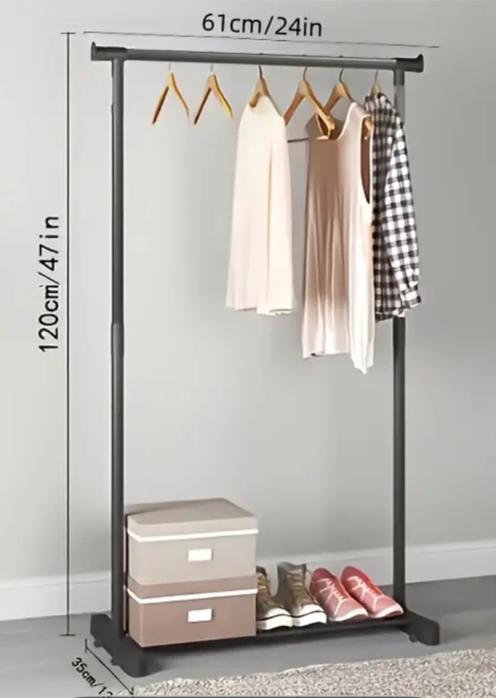 Selling an adjustable height clothes rack. It's black and measures approximately 120cm (47in) tall and 61cm (24in) wide. Great for organizing your clothes!