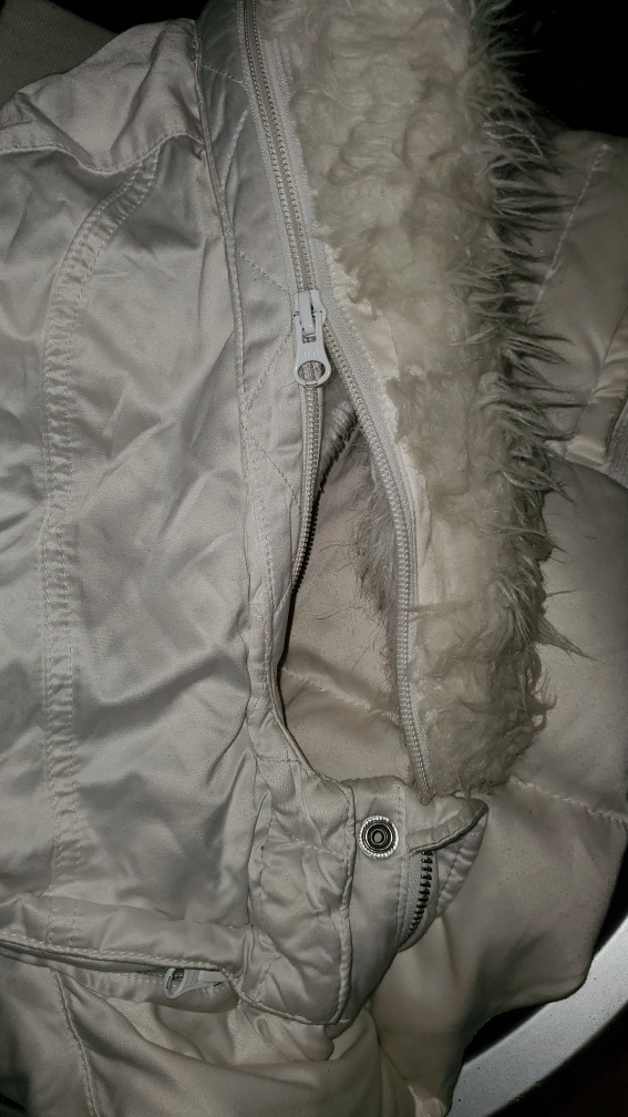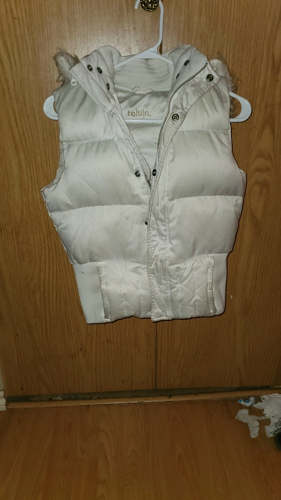 Women's white vest with fur hood. Zipper closure and a fitted waist. The vest is in good condition with no rips or tears. The fur hood is a bit worn but still looks nice.