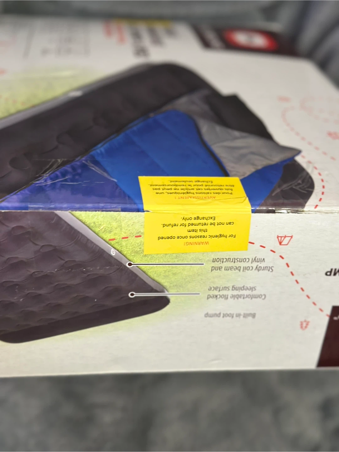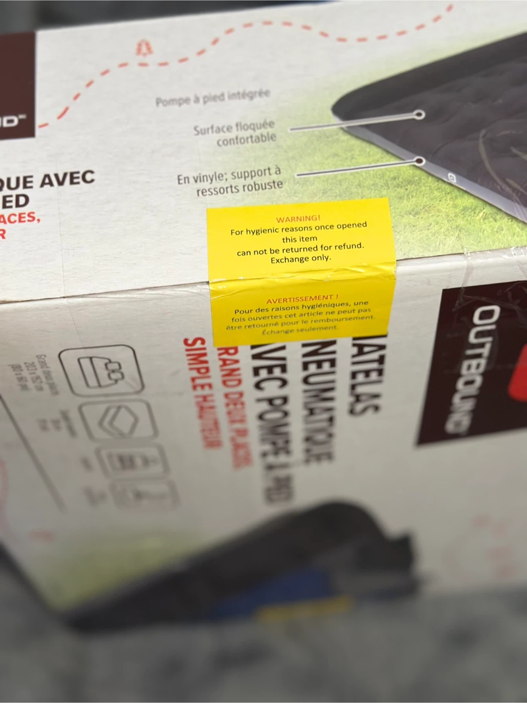 Unused- This Outbound air mattress is a queen single-high size with a built-in foot pump. It measures 203 x 152 cm (80 x 60 inches) and has a weight capacity of 400 lbs. The flocked sleeping surface is comfortable. It inflates in 5-7 minutes and includes a repair patch.