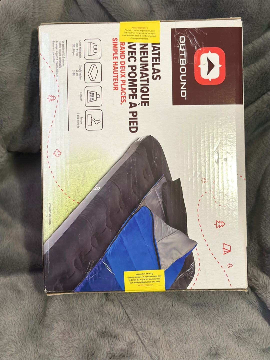Unused- This Outbound air mattress is a queen single-high size with a built-in foot pump. It measures 203 x 152 cm (80 x 60 inches) and has a weight capacity of 400 lbs. The flocked sleeping surface is comfortable. It inflates in 5-7 minutes and includes a repair patch.