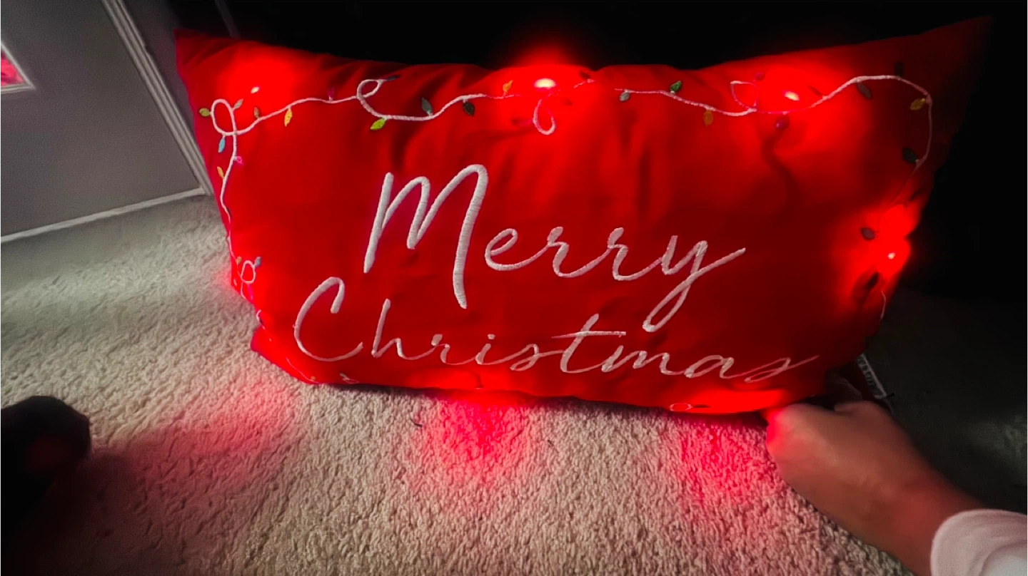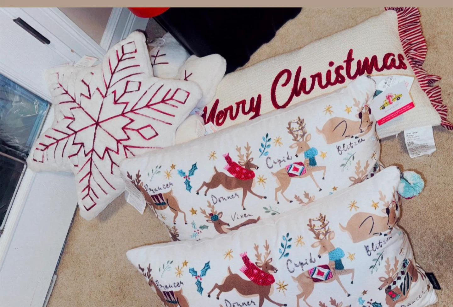 I have a few Christmas decorative pillows for sale. There's a red pillow with lights and 'Merry Christmas' embroidered on it, plus some white pillows with reindeer and snowflakes! Perfect for adding a festive touch to your home this holiday season