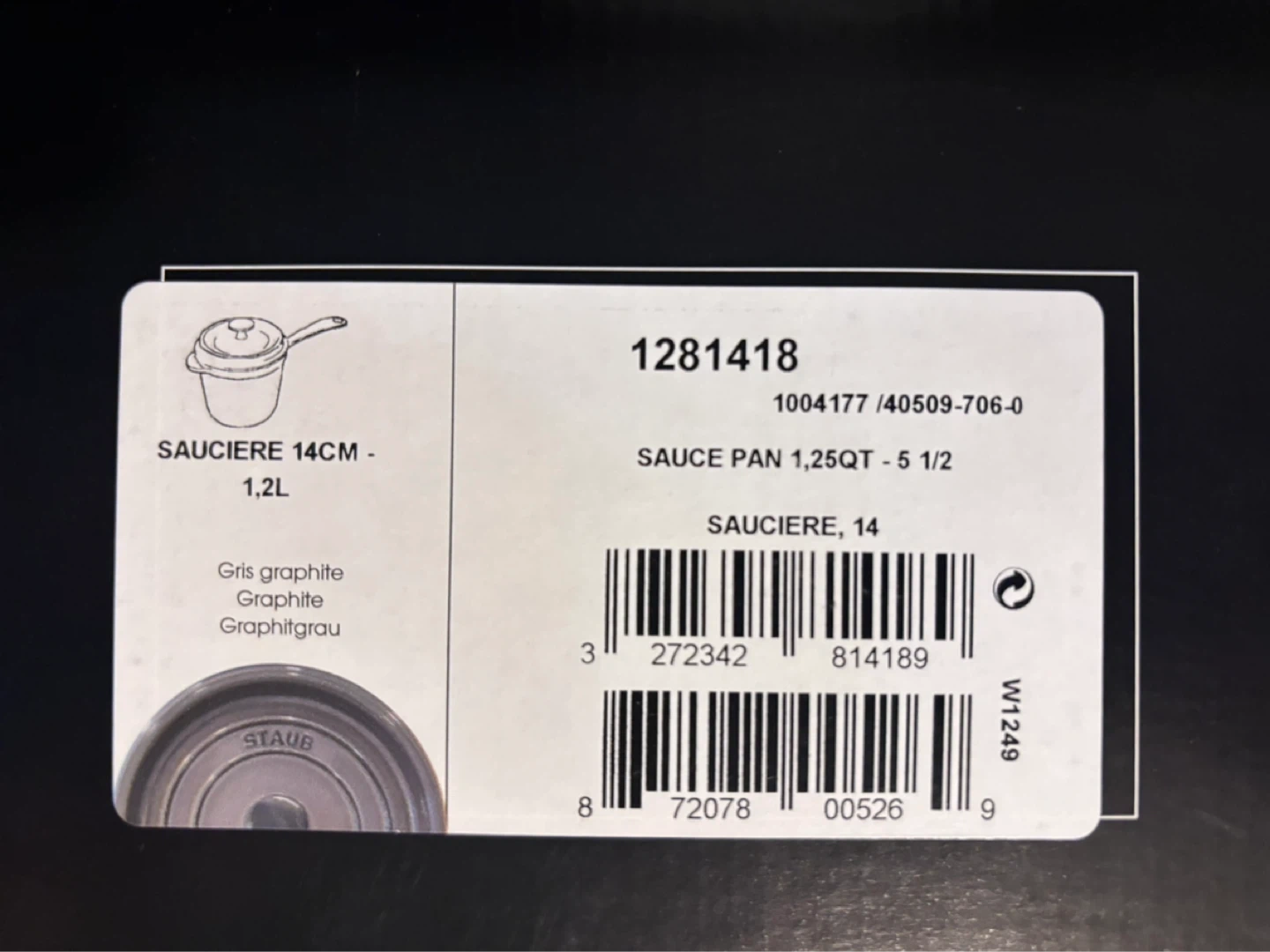 This Staub enameled cast iron sauce pan is 14cm and holds 1.2 litres. It's a beautiful graphite grey colour. This pan is suitable for induction cooking.