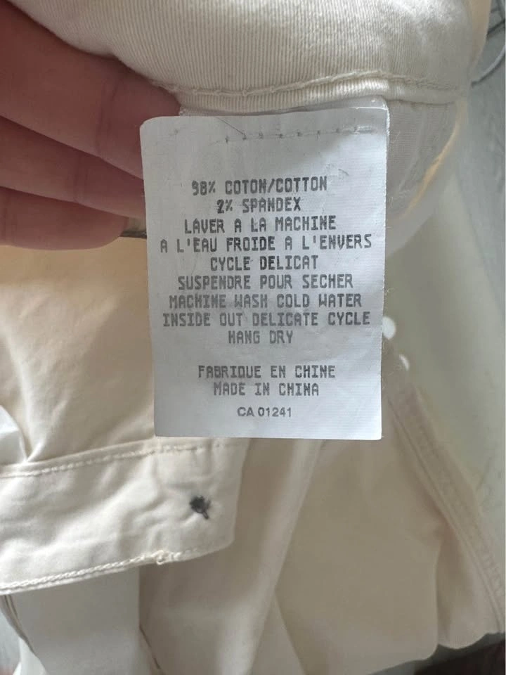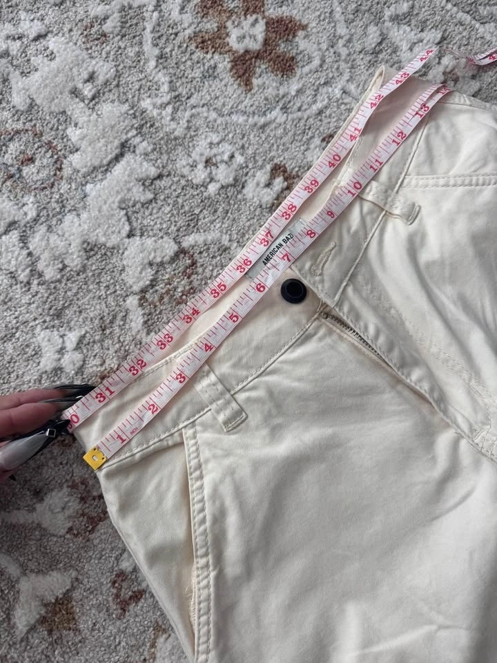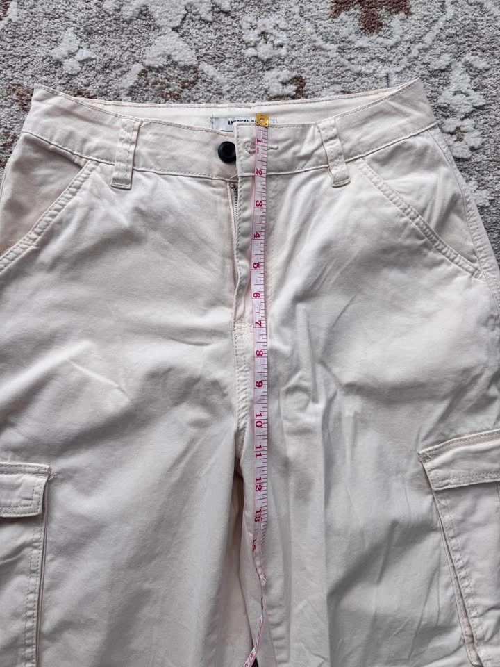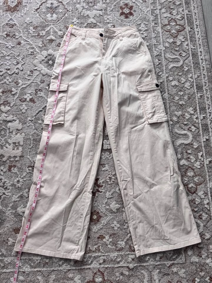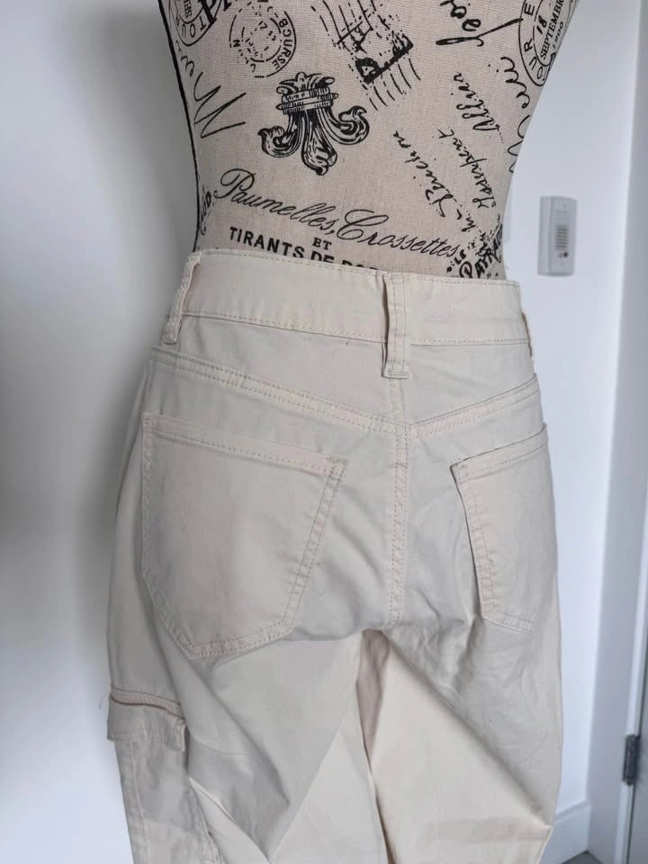Comfy American Bazi cream cargo pants. These wide leg pants have cool cargo pockets on the sides. Waist is about 31 inches, and inseam around 30-31 inches. Pickup in Cougar Ridge.