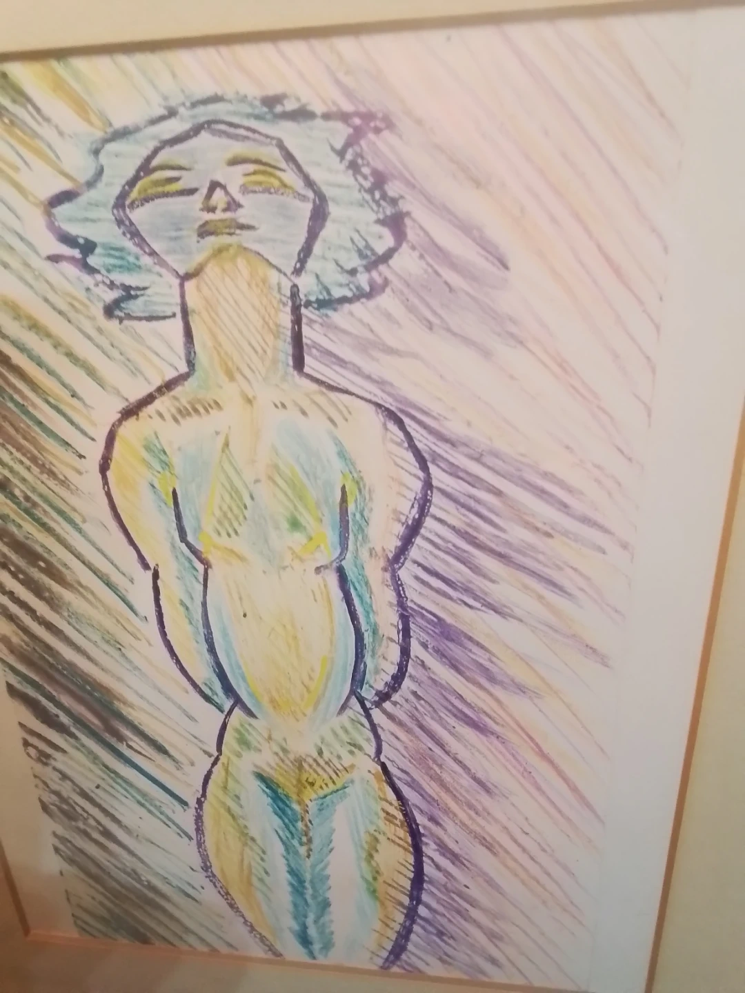 This is a framed nude sketch, measuring 13.75" x 15.75". The artwork features a nude figure drawn in a unique style with vibrant colors, set against a textured background. The frame is a simple gold tone.
