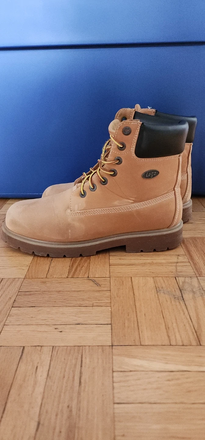 Selling a pair of Lugz work boots in tan leather. They show some signs of wear, as you can see in the photos, but still have plenty of life left in them. Great for work or casual wear!