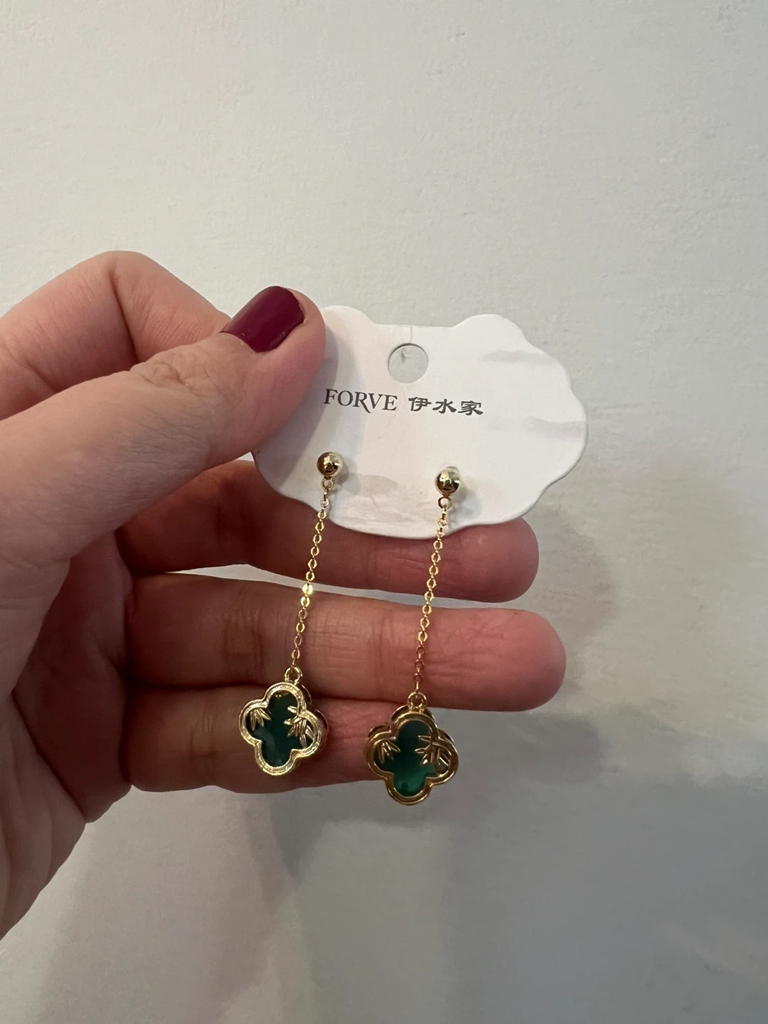 gold-tone drop earrings with green clover charms. The posts are made of S925 silver. These dangly earrings add a touch of elegance to any outfit. Charm features a clover shape with intricate detailing.