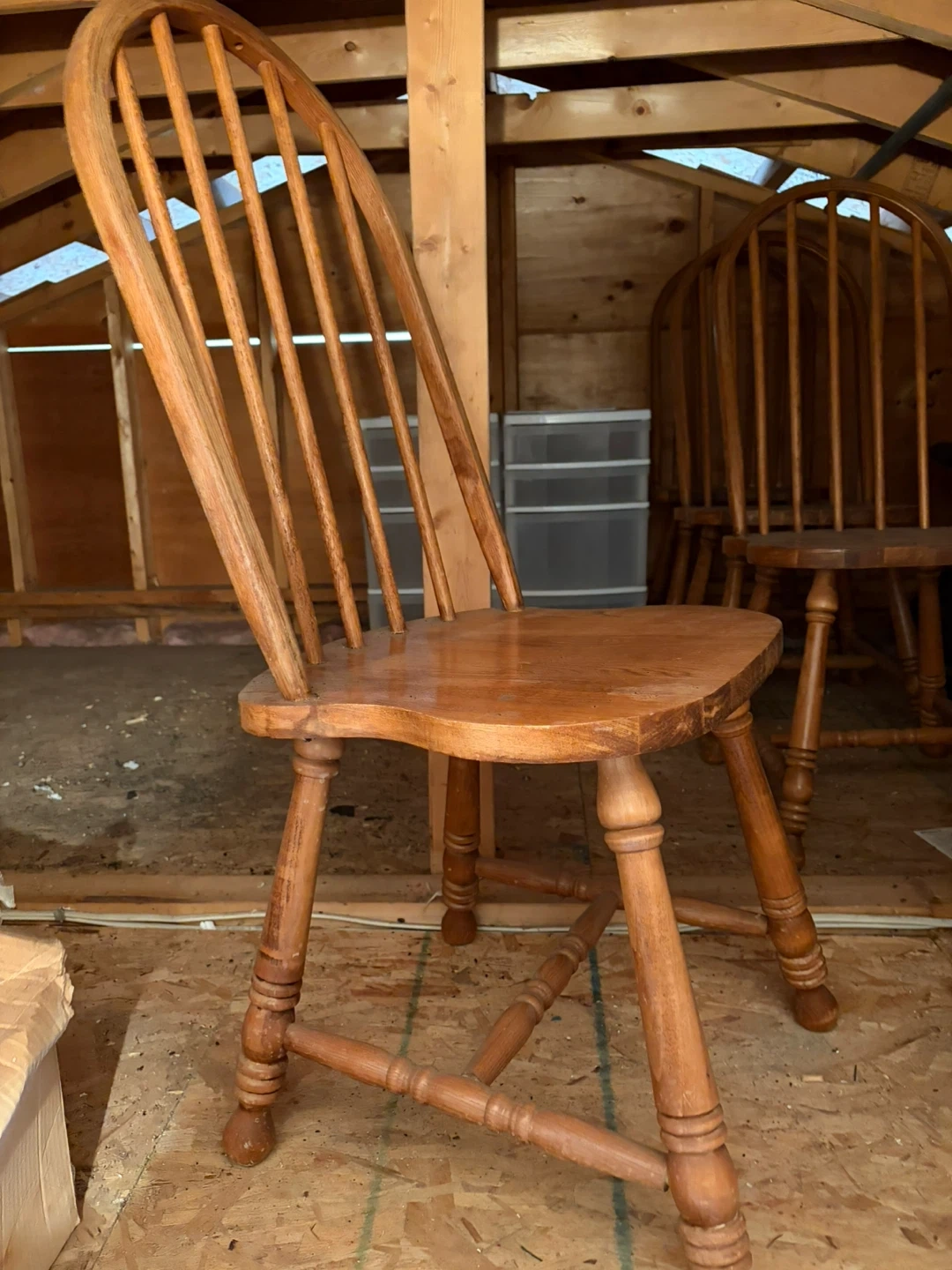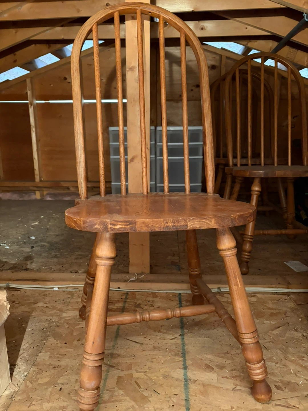 A classic wooden spindle back dining chair. It's made of solid wood with a natural finish. This chair offers a timeless look for any dining space. $20 each. Set of four.