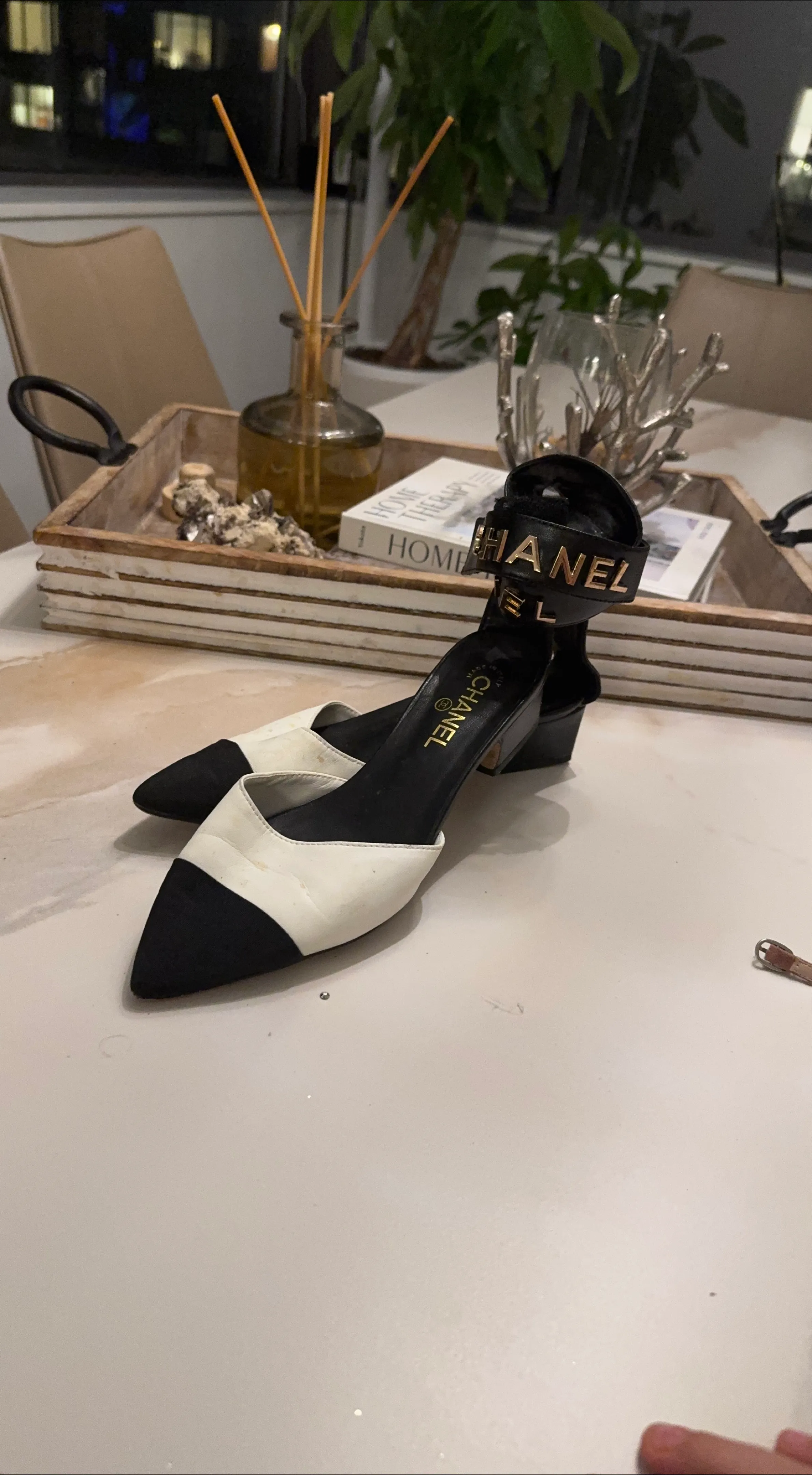 Selling a pair of Chanel slingback heels in black and white. These are a stylish addition to any wardrobe! They show some signs of wear.