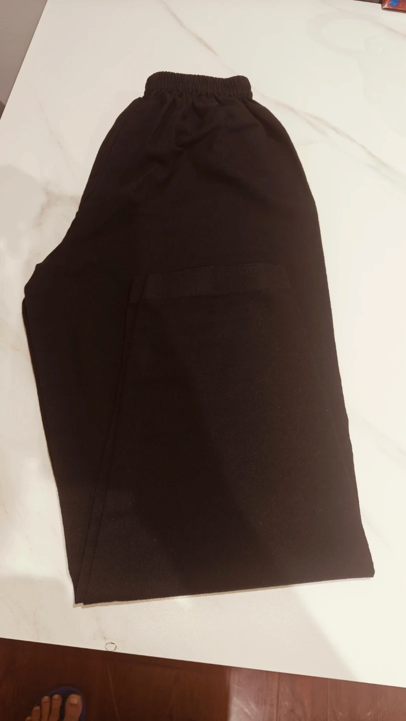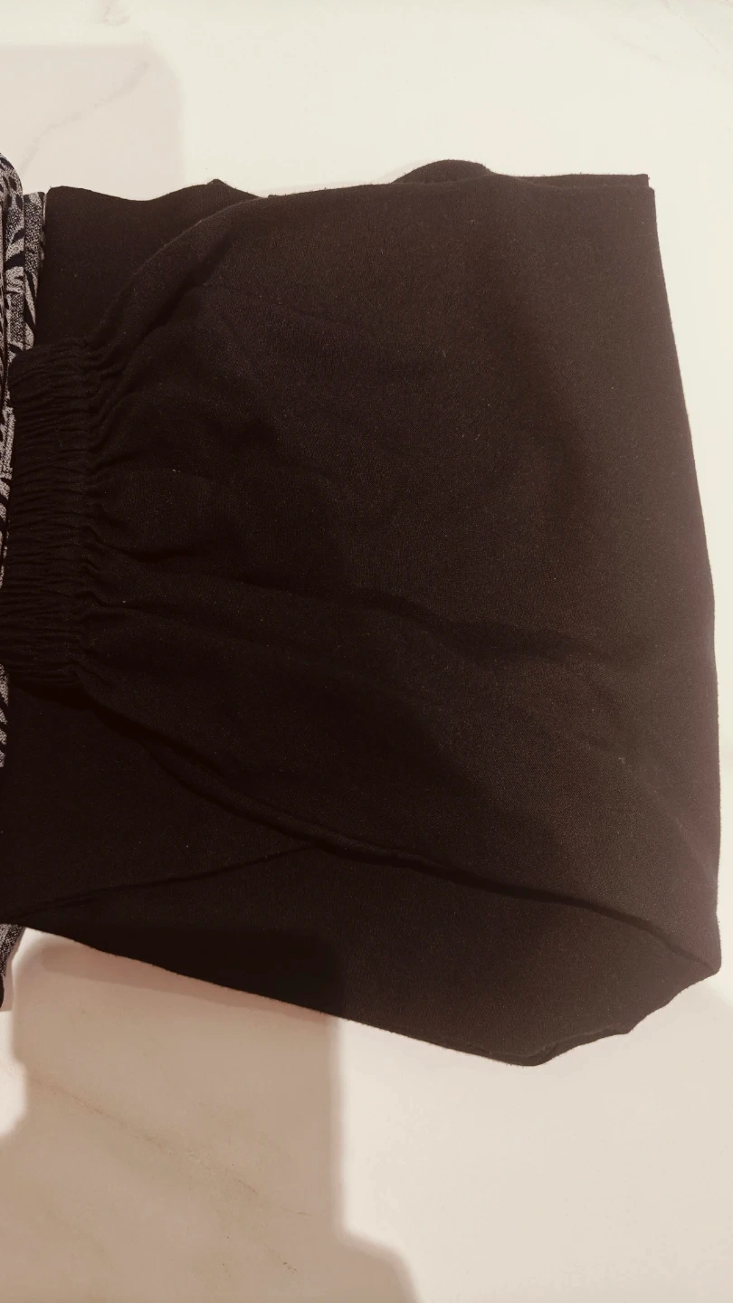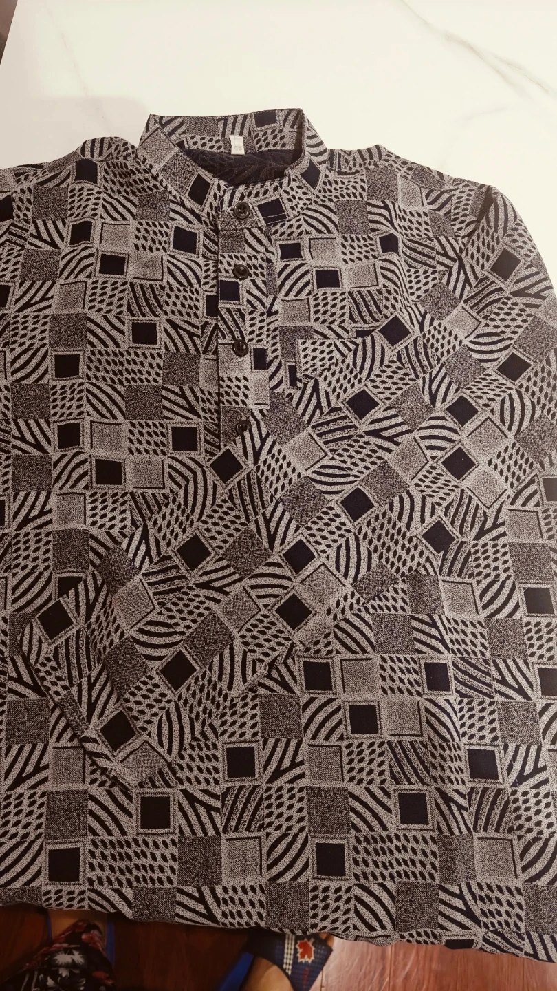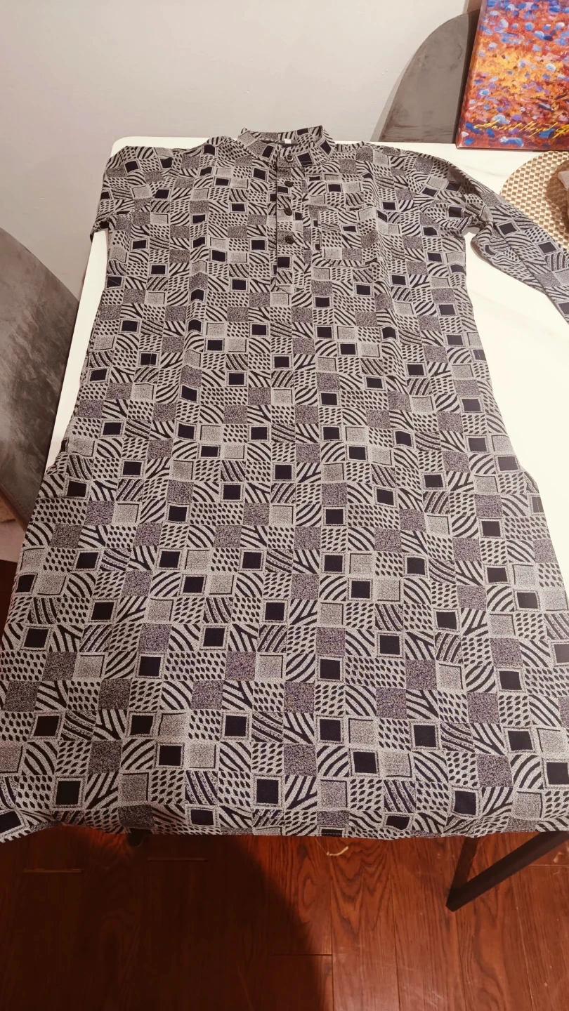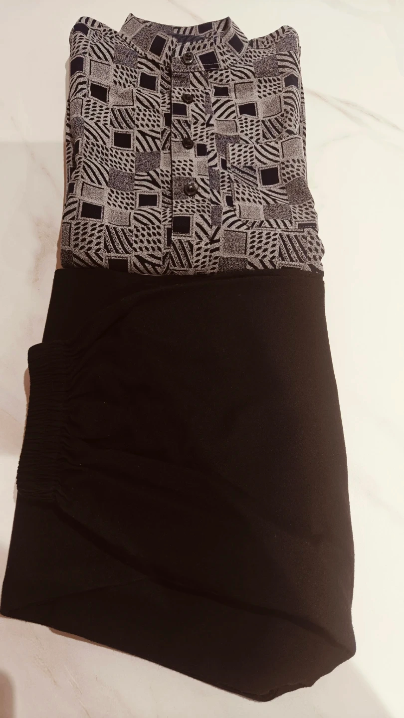 A stylish set featuring a long-sleeved kurta with a unique geometric print and a mandarin collar. It's paired with black elastic-waist pants. This outfit is great for casual outings or Eid