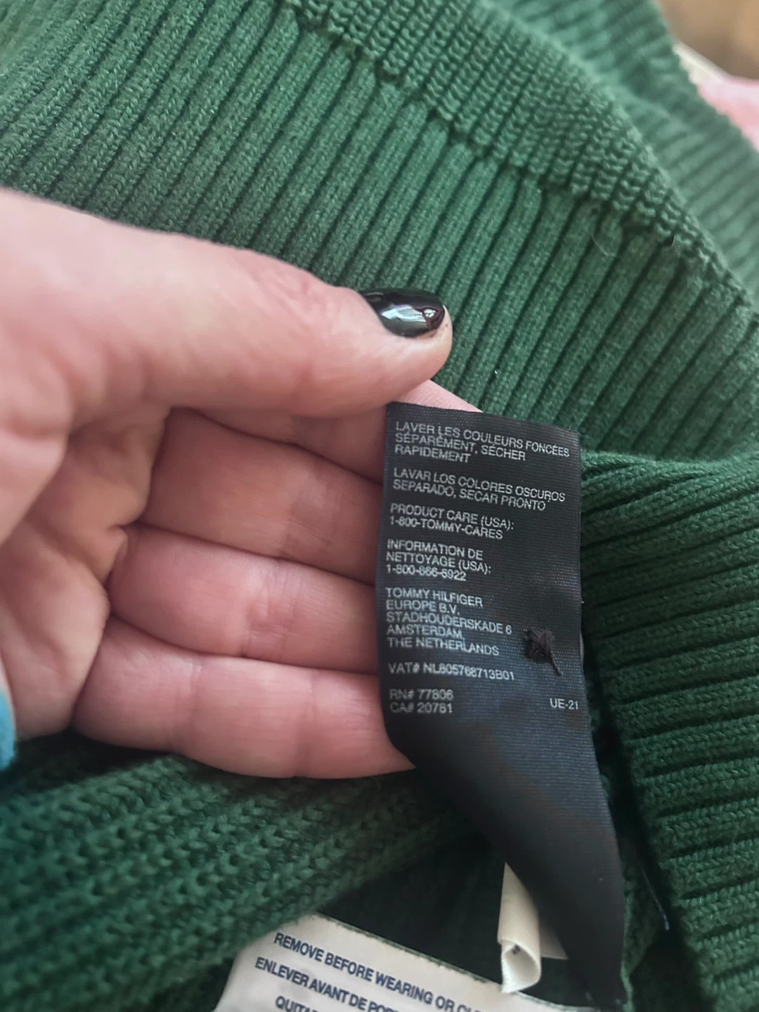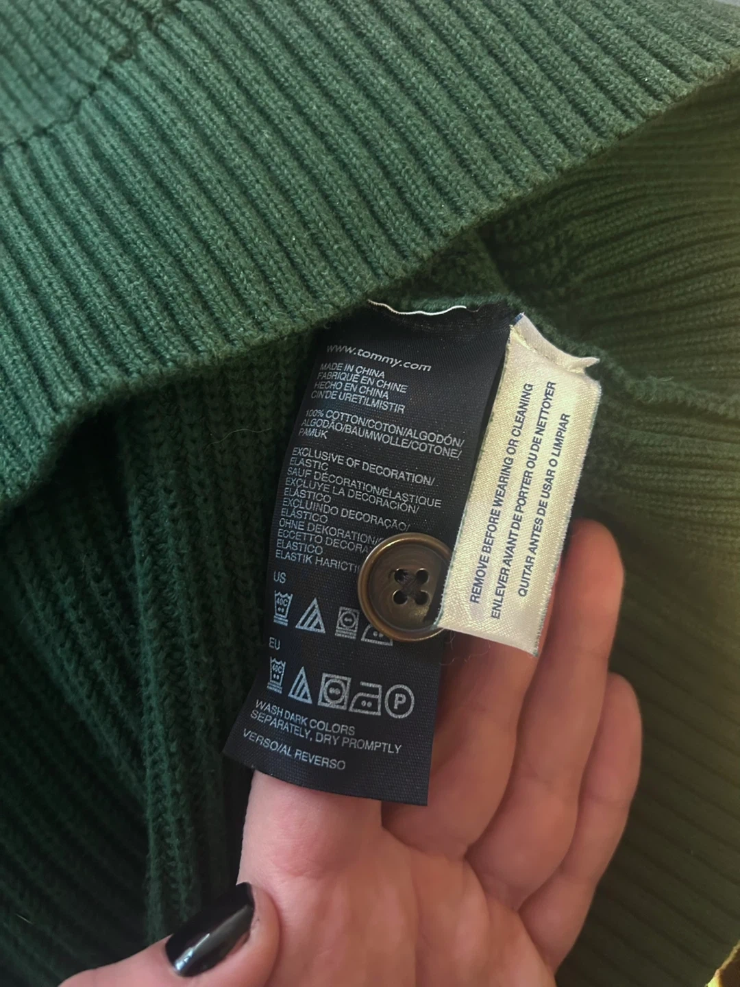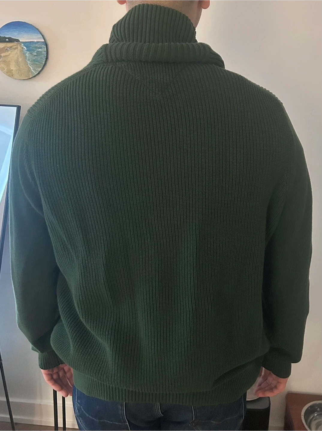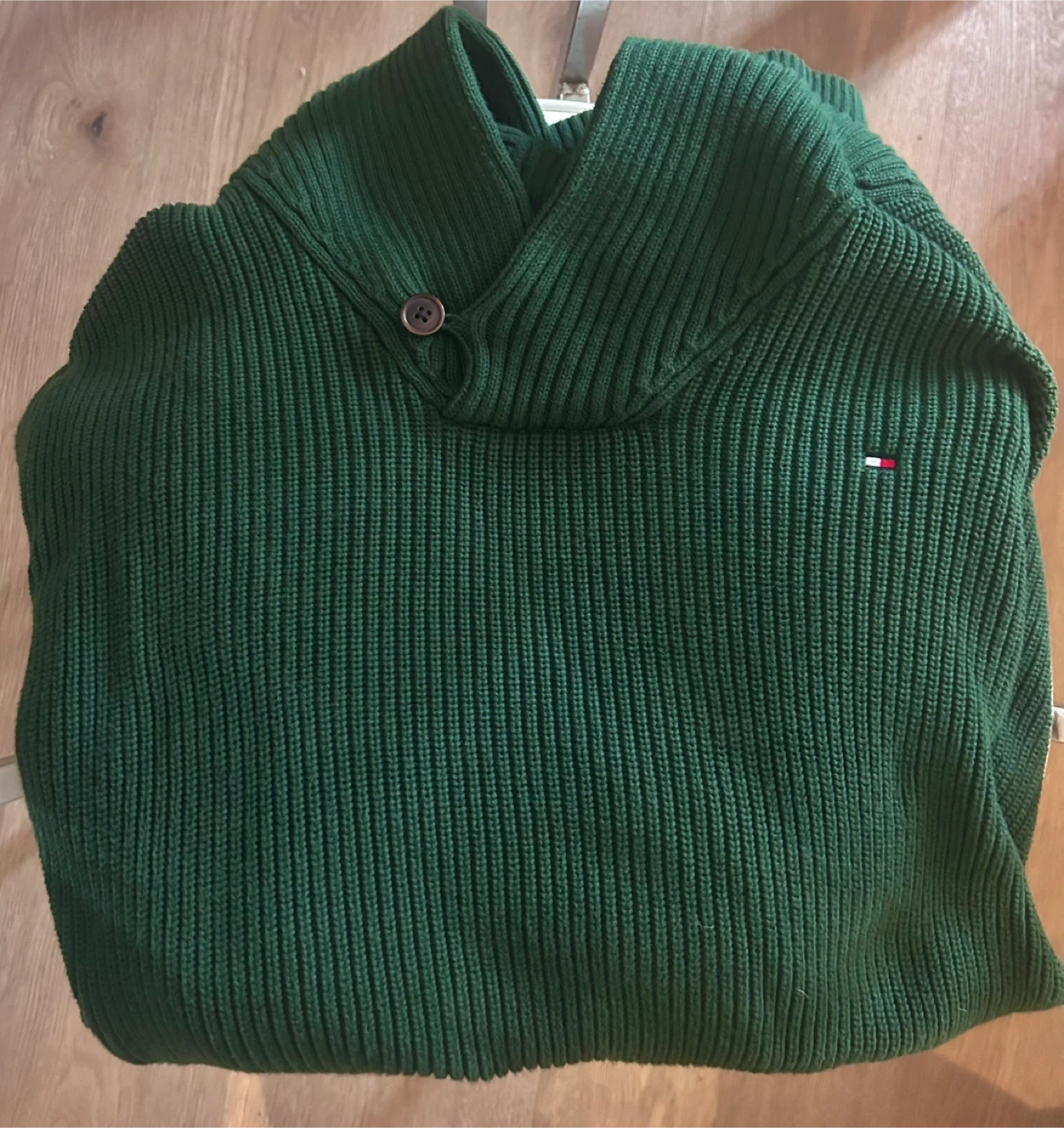 Tommy Hilfiger men's knit sweater in a dark green colour. It features a shawl collar with a button closure. Made from a cotton blend.