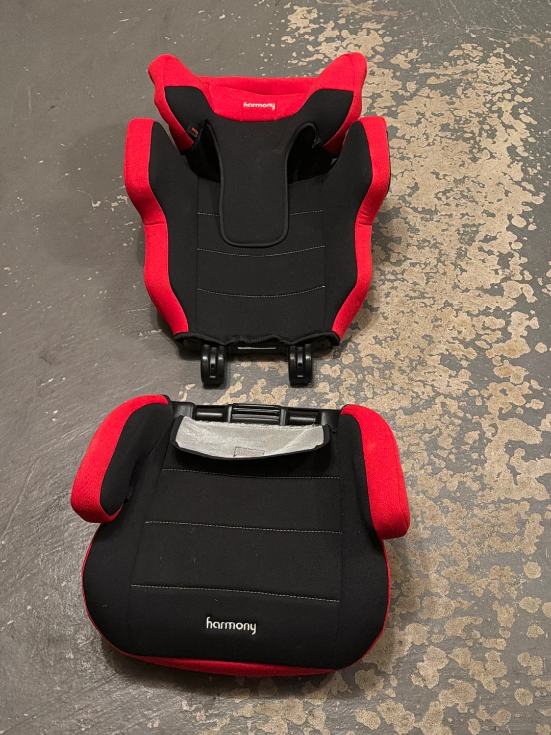 Harmony booster seat in black and red. This seat's fabric is soft and padded for comfort. It's designed for older kids transitioning from a harness to a seat belt. It’s brand new and it can turn from one car seat combined to one smaller one for your child getting older so this is a 2 in 1 car seat