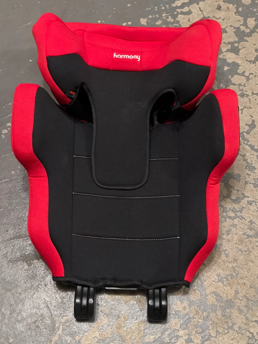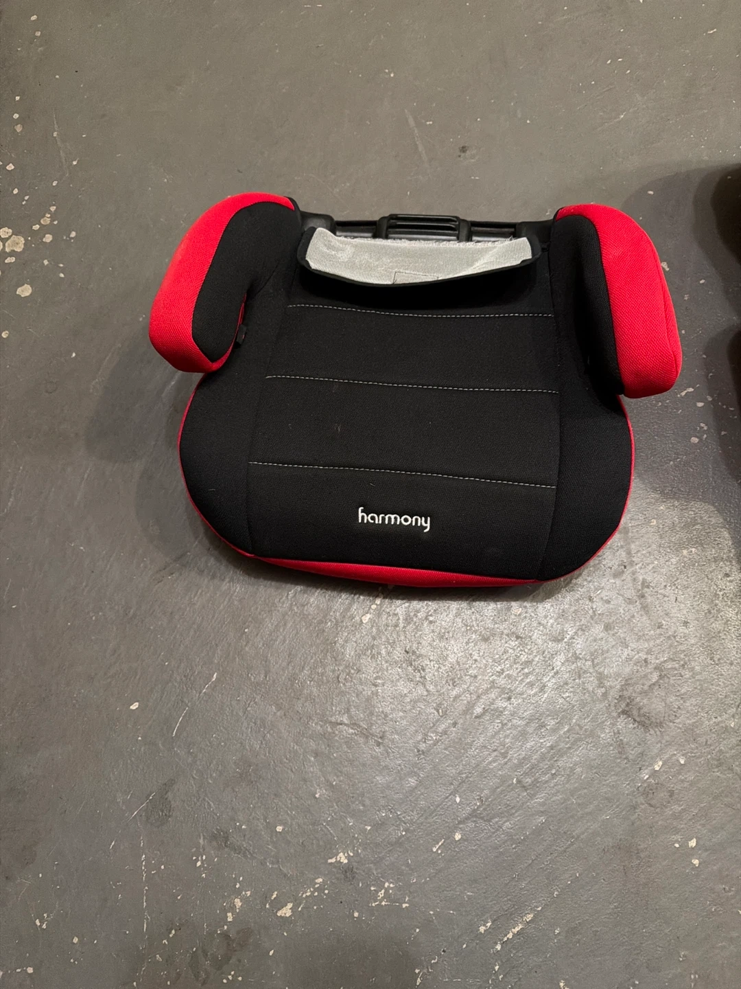 Harmony booster seat in black and red. This seat's fabric is soft and padded for comfort. It's designed for older kids transitioning from a harness to a seat belt. It’s brand new and it can turn from one car seat combined to one smaller one for your child getting older so this is a 2 in 1 car seat