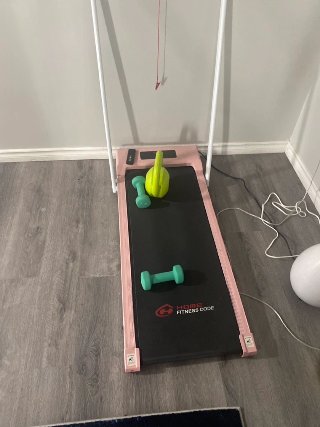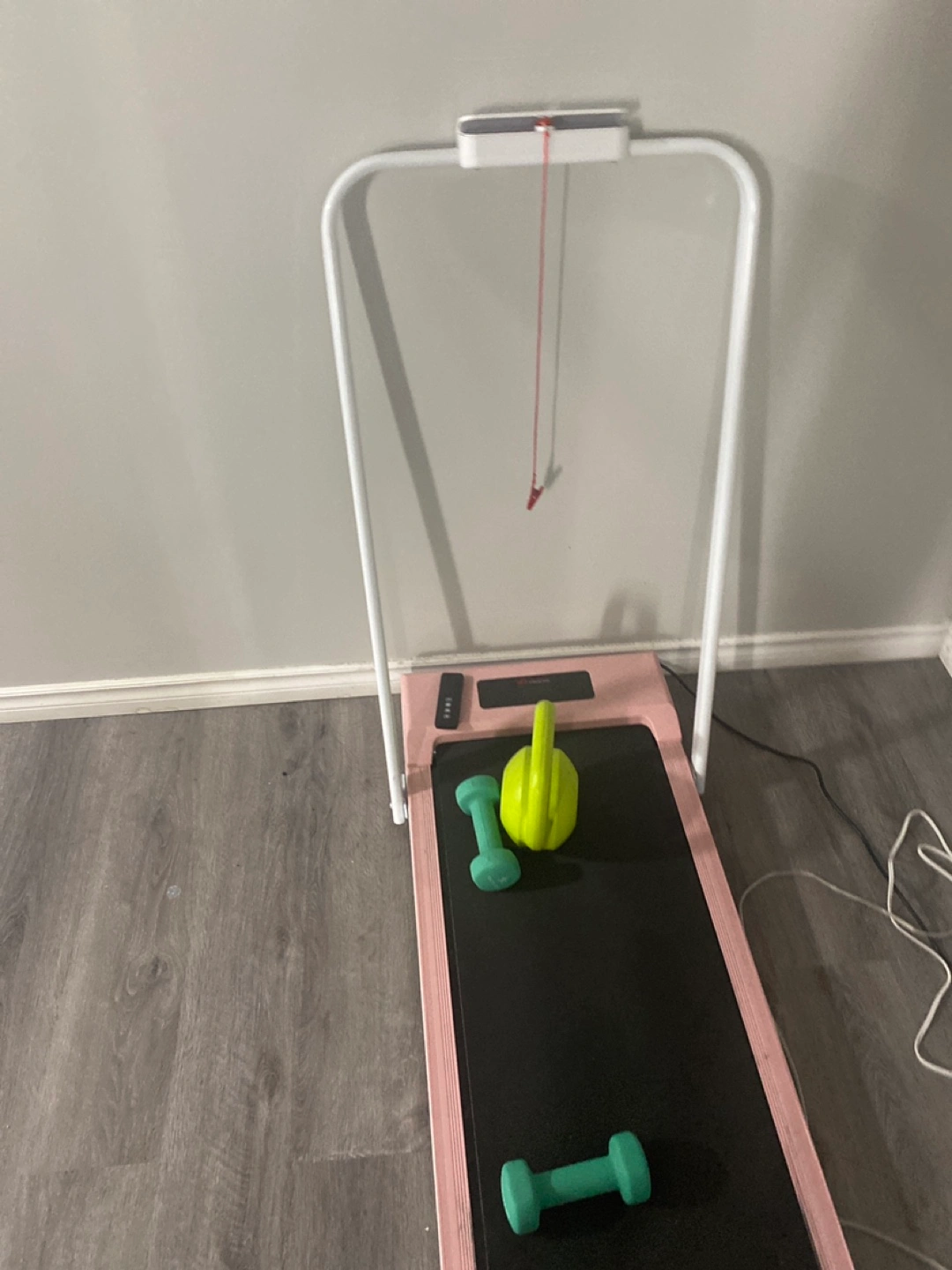 A pink folding treadmill with a built-in display. The treadmill has a remote control. It can also fold easily willing to give dumbbells for free