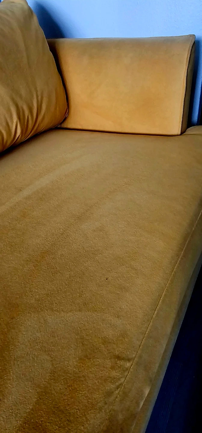 Gus Modern Margot sofa upholstered in gold Leaf velvet-like Dacron fabric. Features French seam detailing and elegantly-shaped armrests. Set on shiny brass legs. Gus Modern Margot Sofa a contemporary piece a rare find in gold Leaf velvet color.