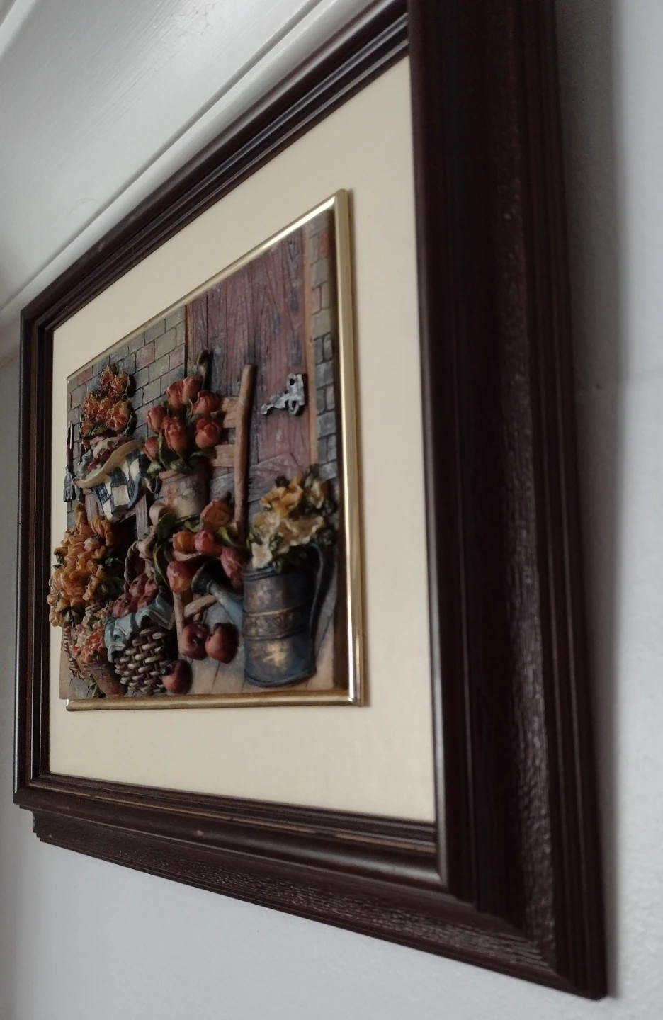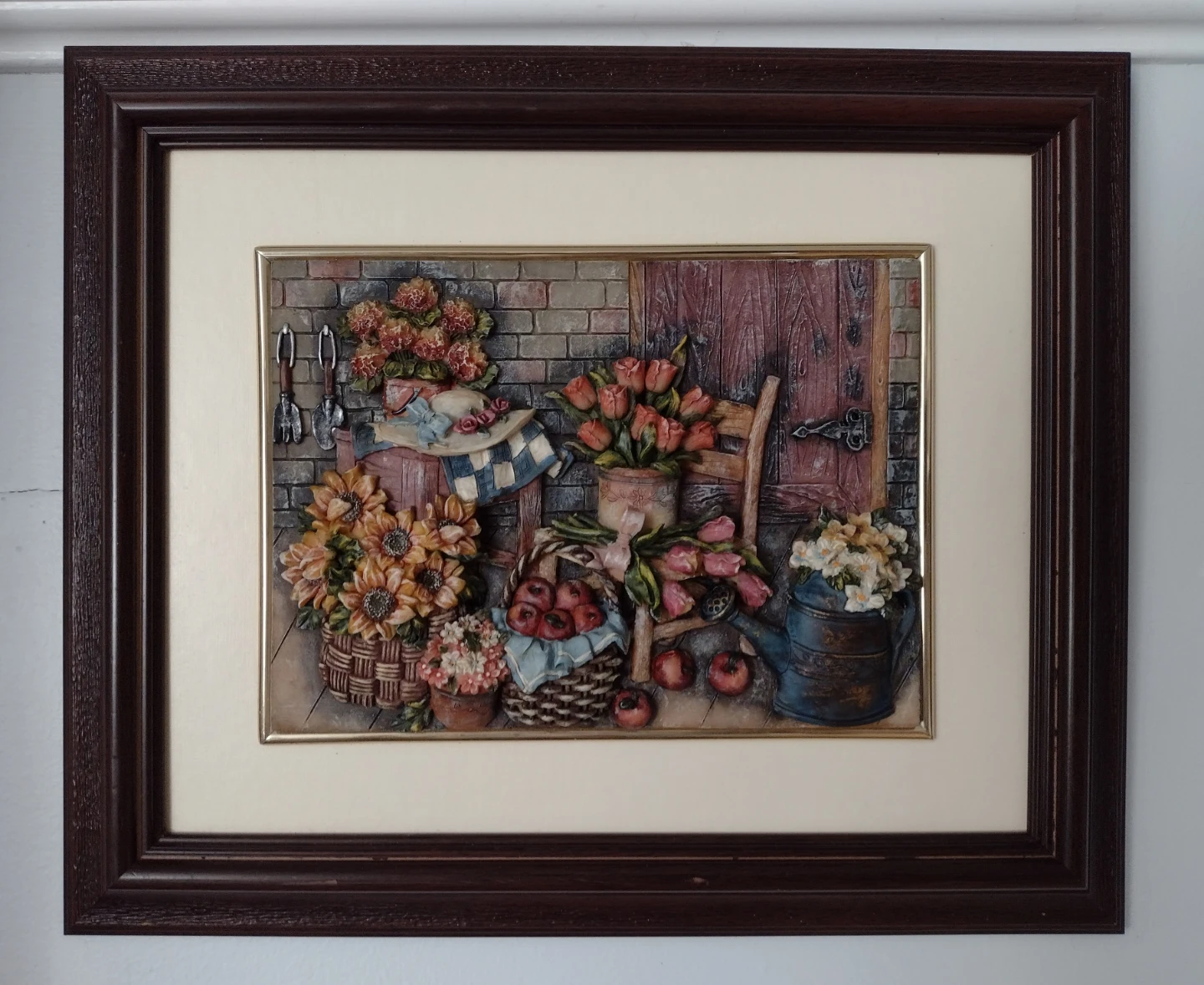 This framed 3D wall art piece displays a charming scene with baskets of flowers, fruit, and gardening tools. The artwork has a textured, dimensional quality and is housed in a dark brown wooden frame with a cream matting. It's a lovely decorative addition for a home.