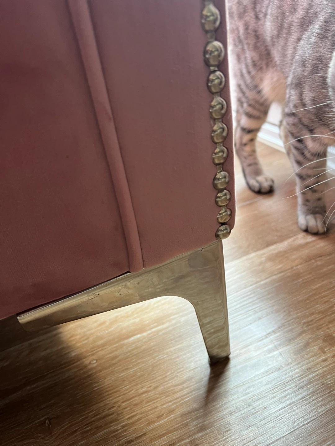 This beautiful pink velvet sofa features deep tufting and stylish rolled arms. It comes with two accent pillows for added comfort and flair. The silver nailhead trim and crystal-like buttons add a touch of elegance to any living space.
