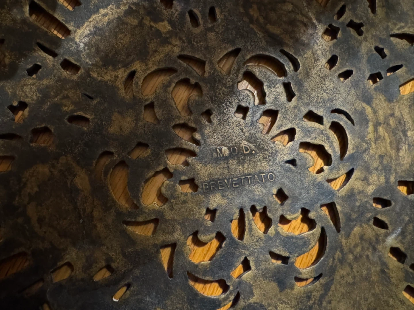 Ornate antique heavy brass plant stand has intricate scrollwork and floral patterns throughout. This piece features a two-tier design with a larger top surface and a smaller lower shelf. Underside is marked with 'MOD. BREVETTATO' indicating its Italian origin. The brass has a natural aged patina in the detailed carvings. Sturdy tripod base ends in decorative feet. A lovely addition to your home.