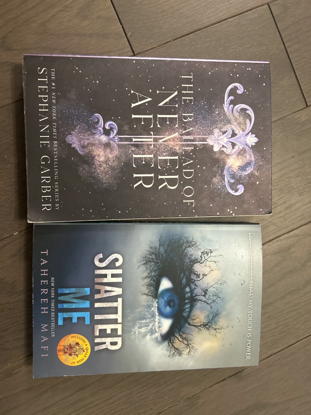 Two young adult fantasy novels. 'The Ballad of Never After' is by Stephanie Garber. 'Shatter Me' by Tahereh Mafi includes bonus content. Both are paperback editions.
