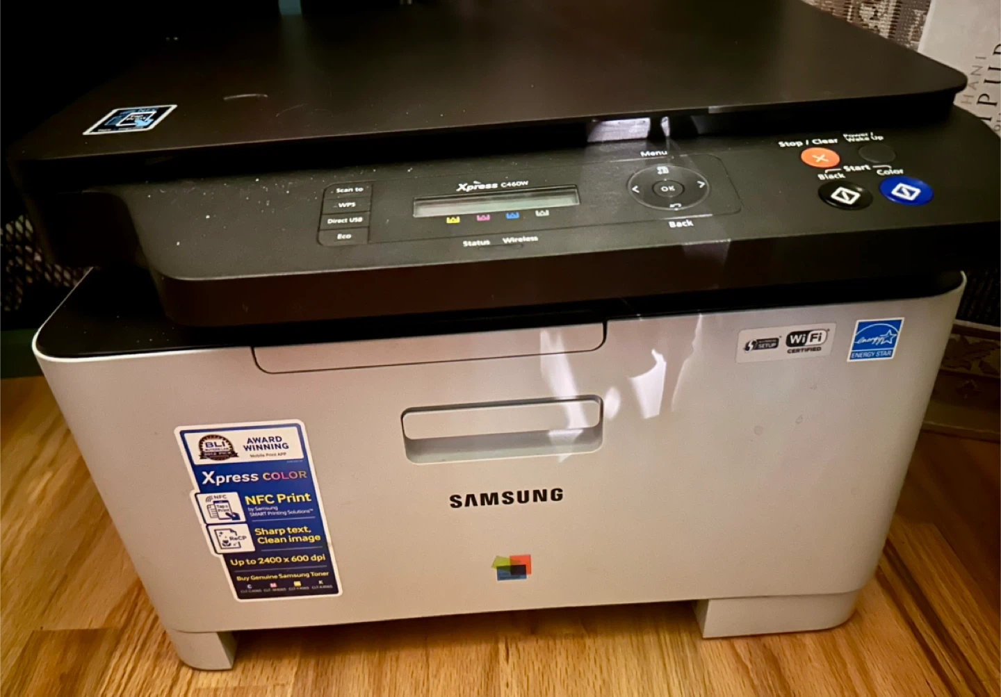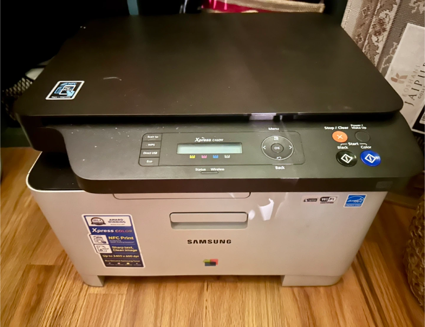 This is a Samsung Xpress C440W colour laser printer. It supports NFC print and has a resolution of up to 2400 x 600 dpi. It's great for sharp text and clean images. Includes black and color cartridges already installed. Also comes with an installation CD. Worked well when we were using but has been in storage since we bought another one.