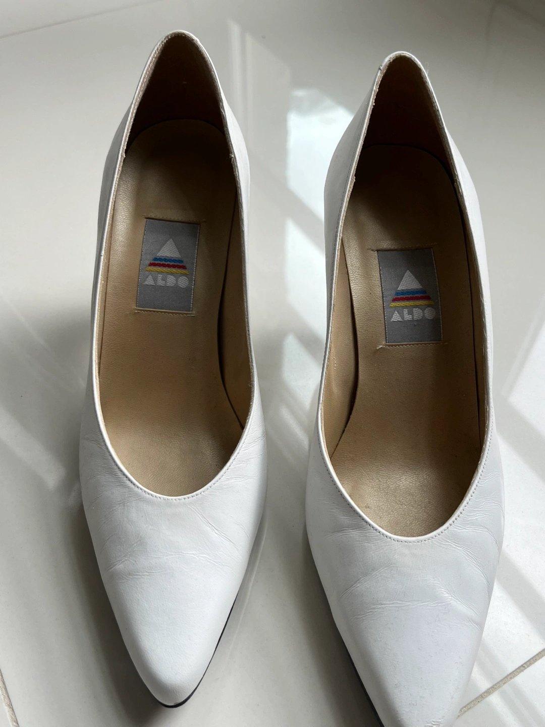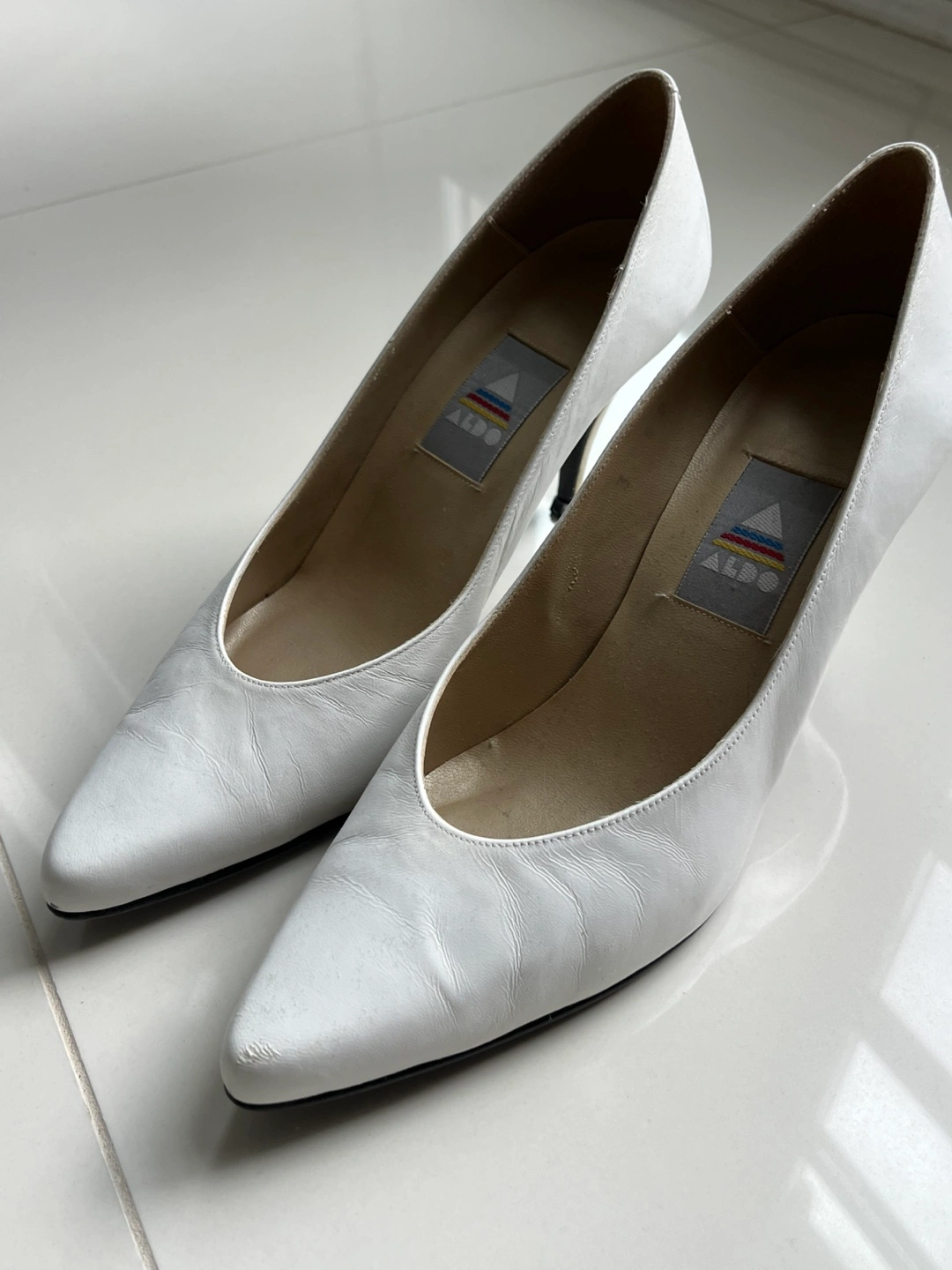 These are classic white pointed-toe heels from ALDO. They're made of leather and have a modest heel height. Minor scuffing on heel tips. One heel tip is missing -priced accordingly. Otherwise in good condition.