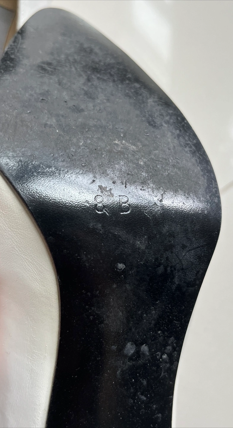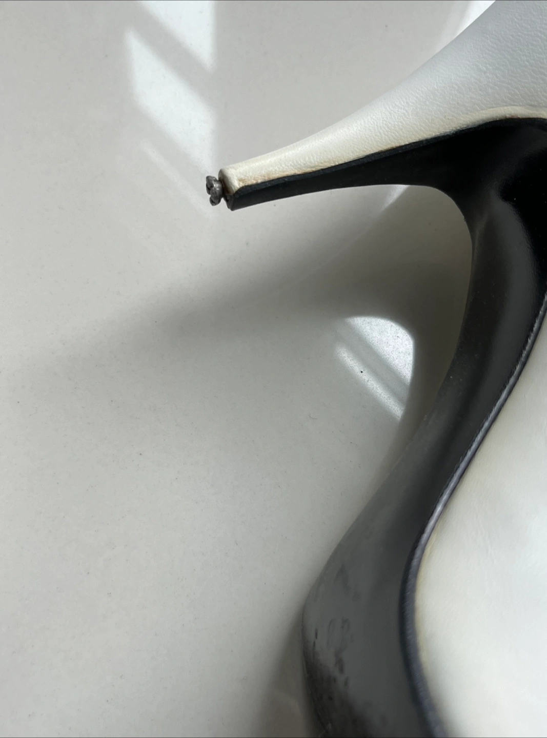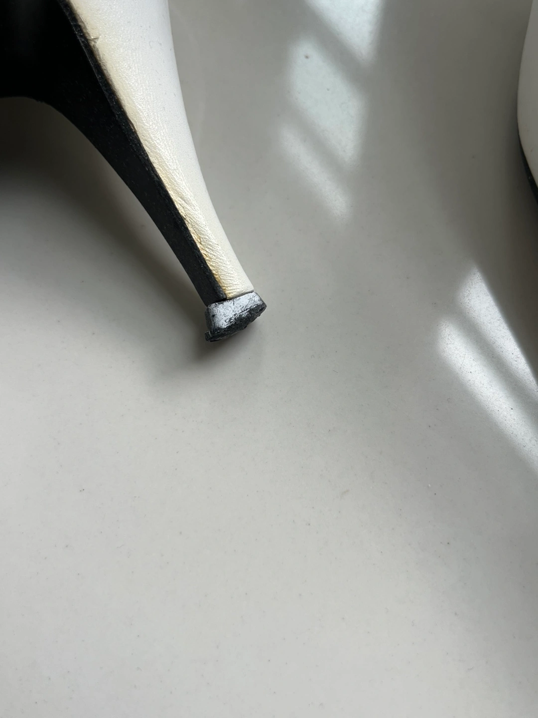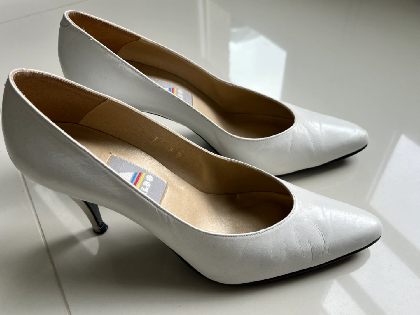 These are classic white pointed-toe heels from ALDO. They're made of leather and have a modest heel height. Minor scuffing on heel tips. One heel tip is missing -priced accordingly. Otherwise in good condition.