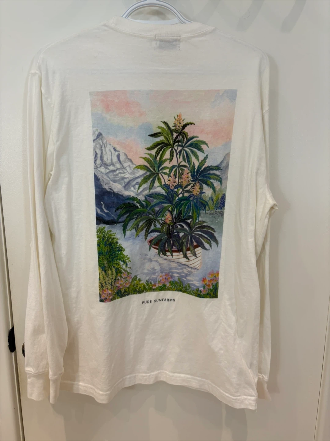 This is a Pure Sunfarms long sleeve t-shirt with "Pink Kush" printed on the front. The back features a colourful graphic of a cannabis plant by a lake with mountains. It's a size Large.