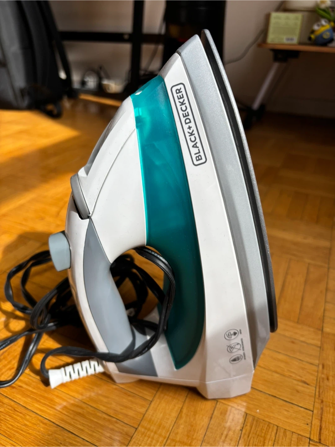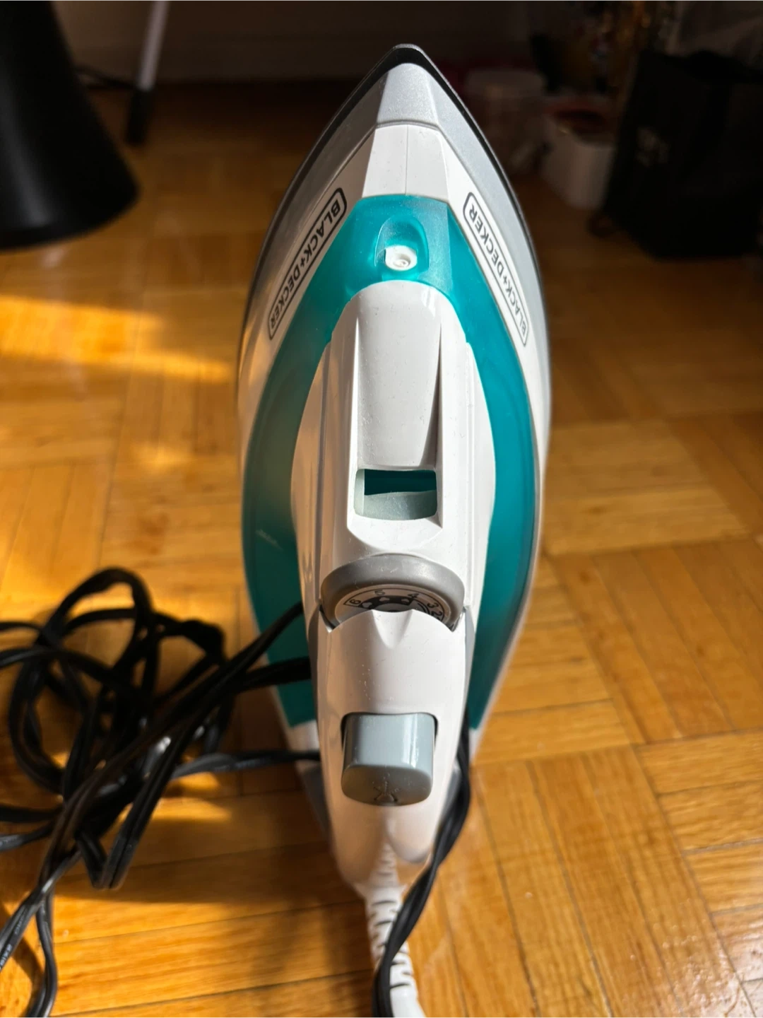 This is a BLACK+DECKER iron with a teal water reservoir. It has a power cord and adjustable temperature settings. This iron is great for tackling wrinkles on your clothes.