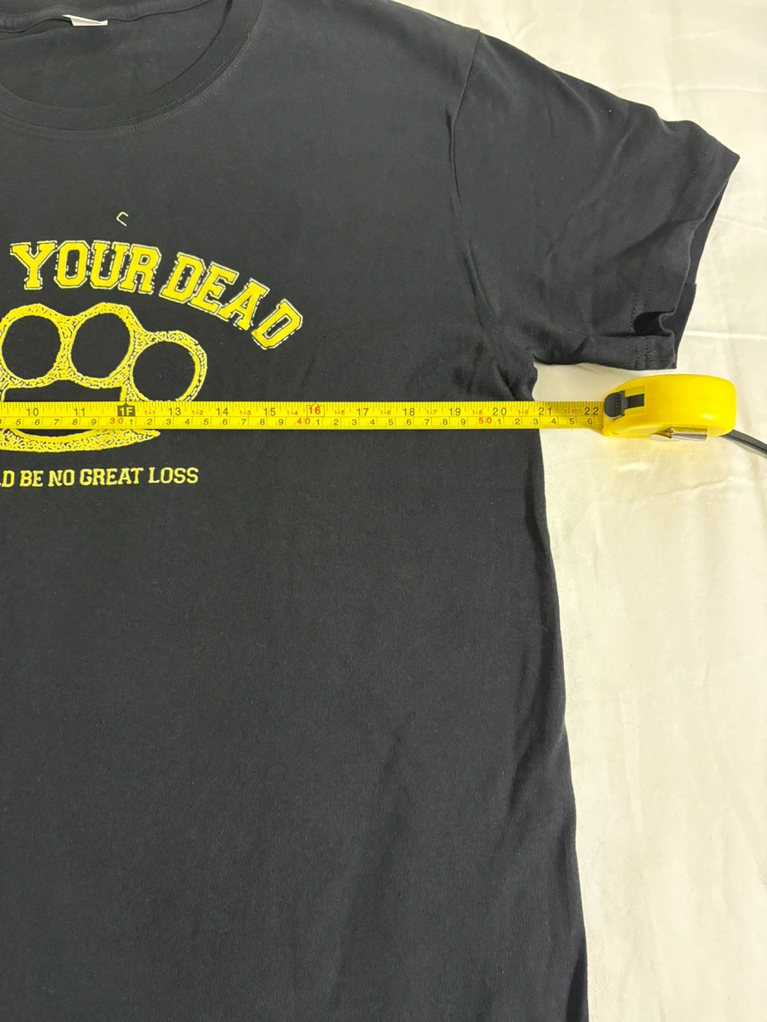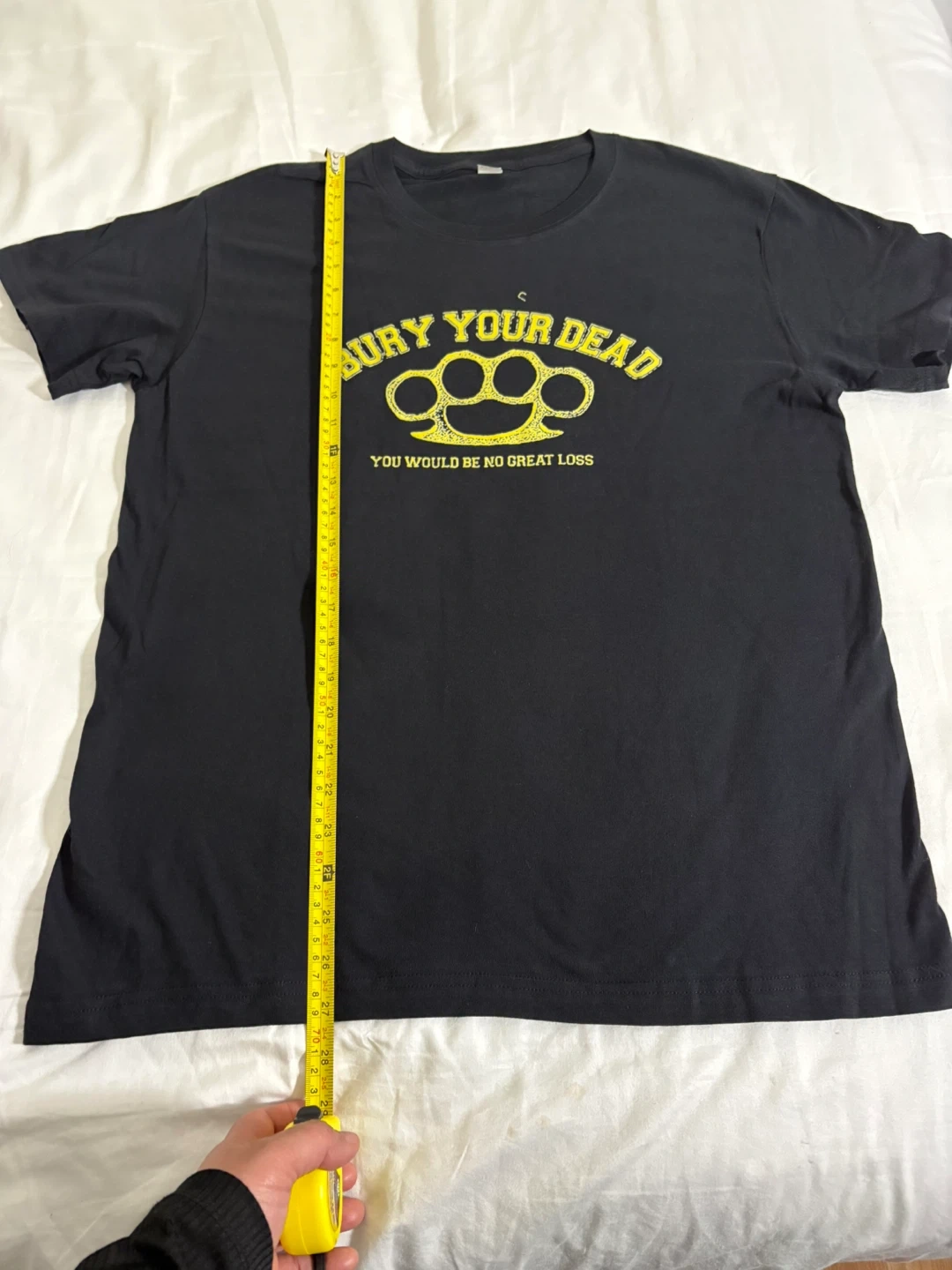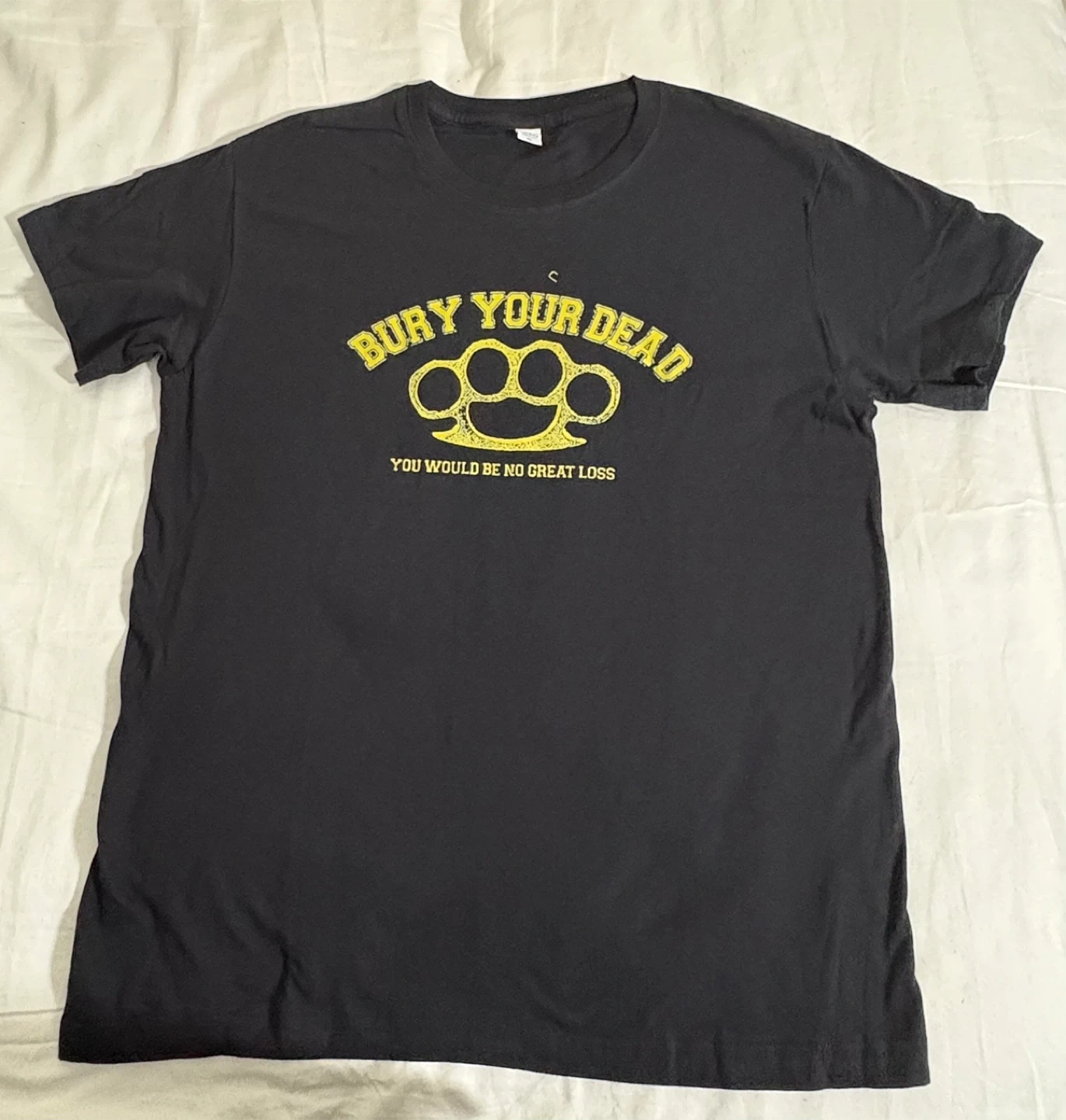 Buy & SellBlack XL "Bury Your Dead" Graphic T-ShirtBlack XL "Bury Your Dead" Graphic T-Shirt$5Black XL t-shirt with a graphic that says "Bury Your Dead" with brass knuckles and "You Would Be No Great Loss". 100% cotton. Made in China.ConditionNewWHERE TO MEET99 Marble Hill AveView MapSELLERverifiedclaudiaMarble Hill872 reviews0 chats·0 favorites·1 viewsSEND CHAT TO SELLERHi claudia! I’m interested in your listing.Hi claudia! I’m interested in your listing.Get the Karrot app to chatSign In to chat