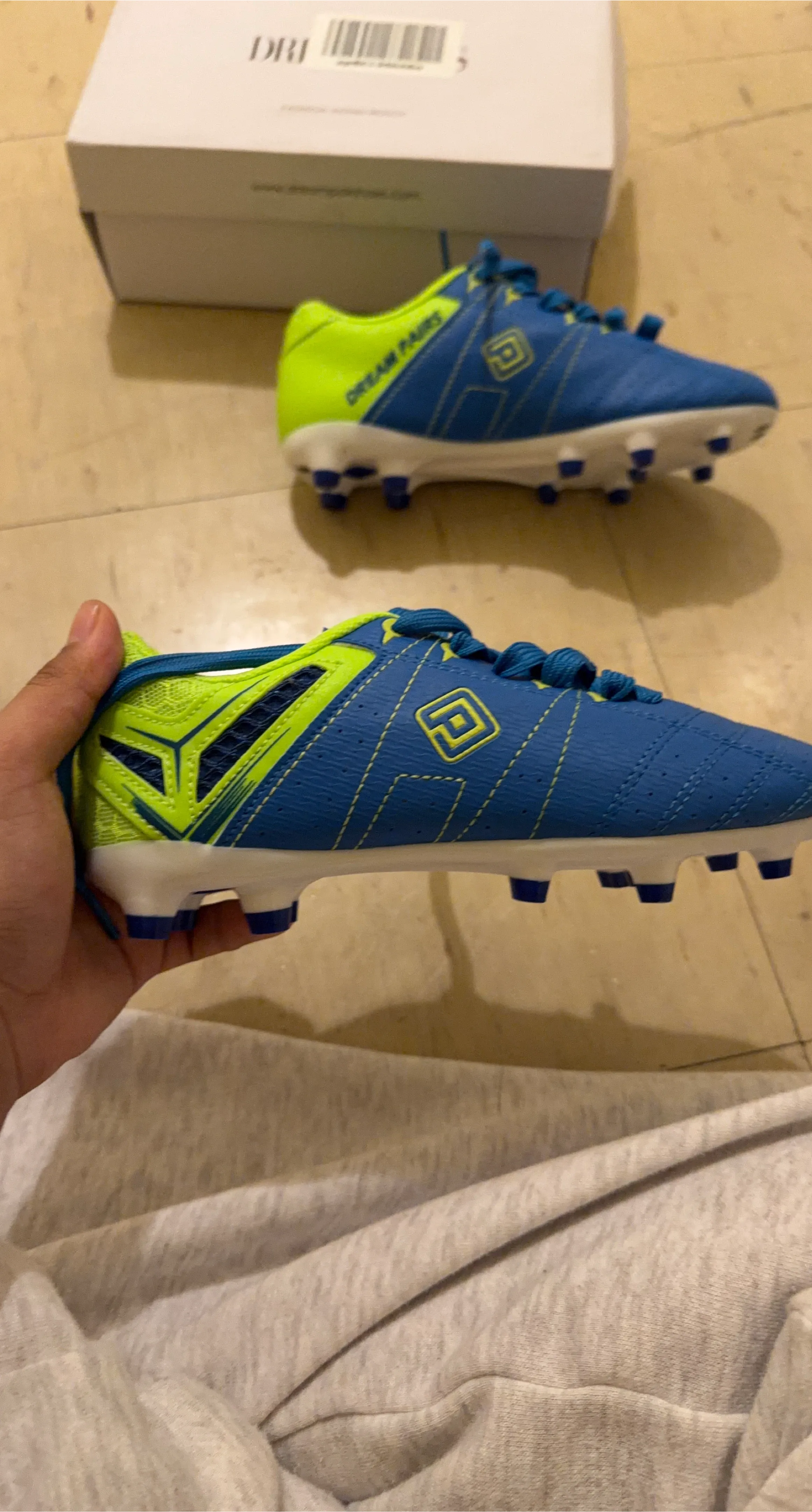 Dream Pairs soccer cleats in blue with neon yellow accents. These cleats are designed for performance on the field. They feature a durable synthetic upper and a studded outsole for traction. The original box is included.