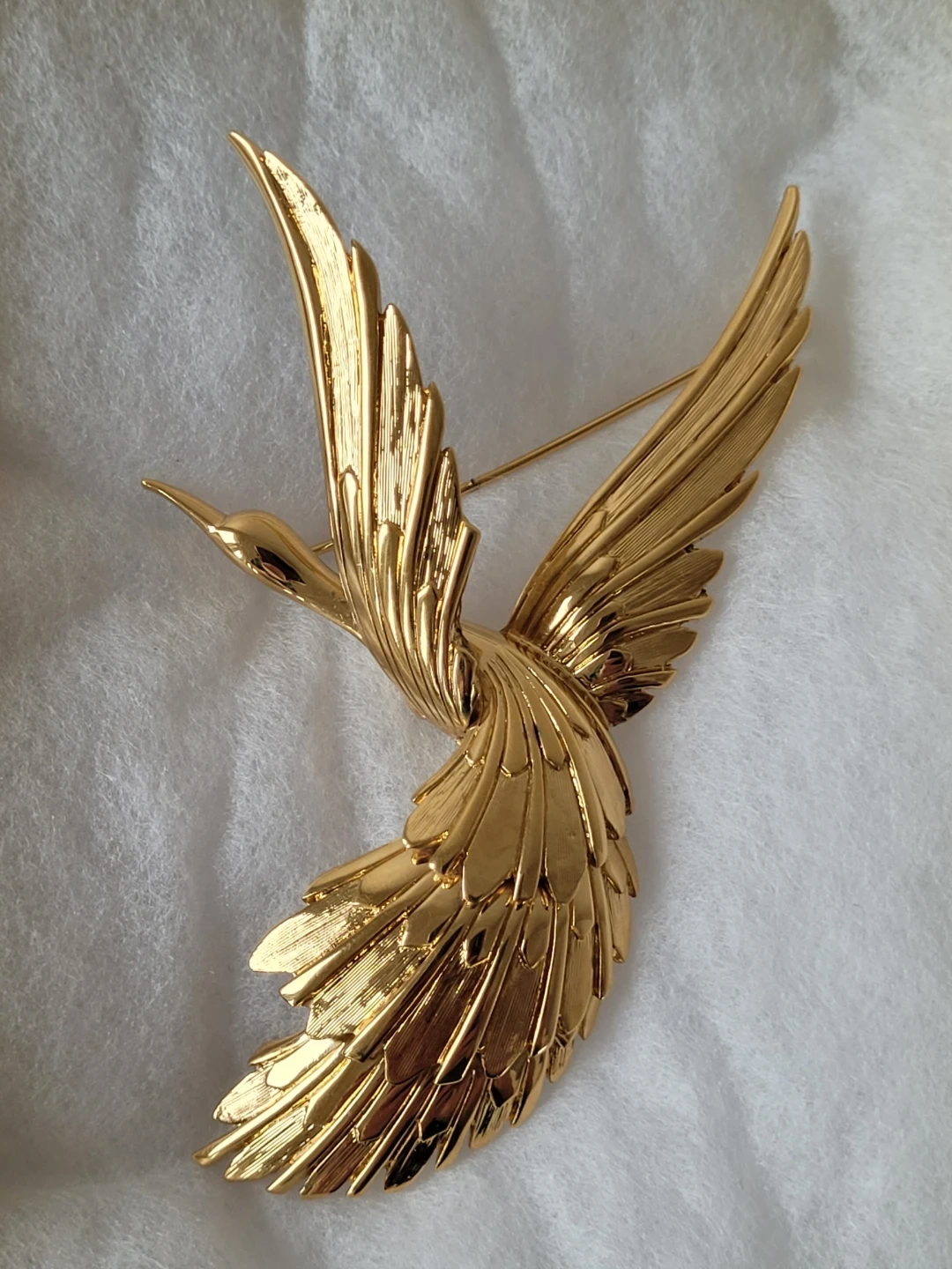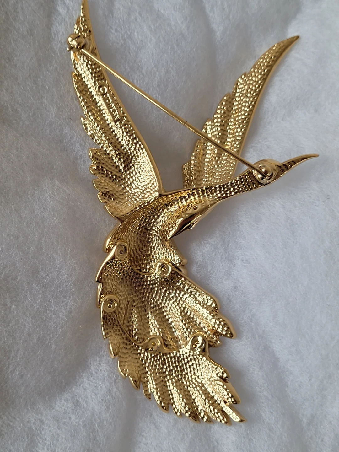 This is a beautiful gold-tone brooch designed as a bird in flight. It's crafted with intricate detailing on the feathers. It's a lovely accessory to add some flair to an outfit!