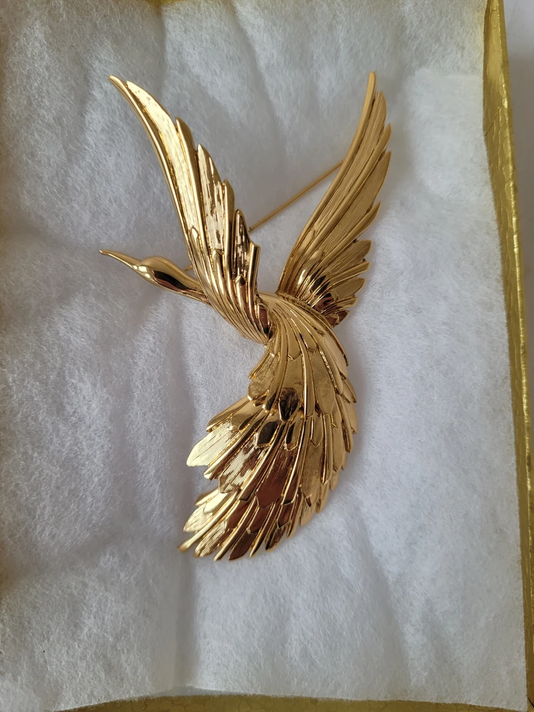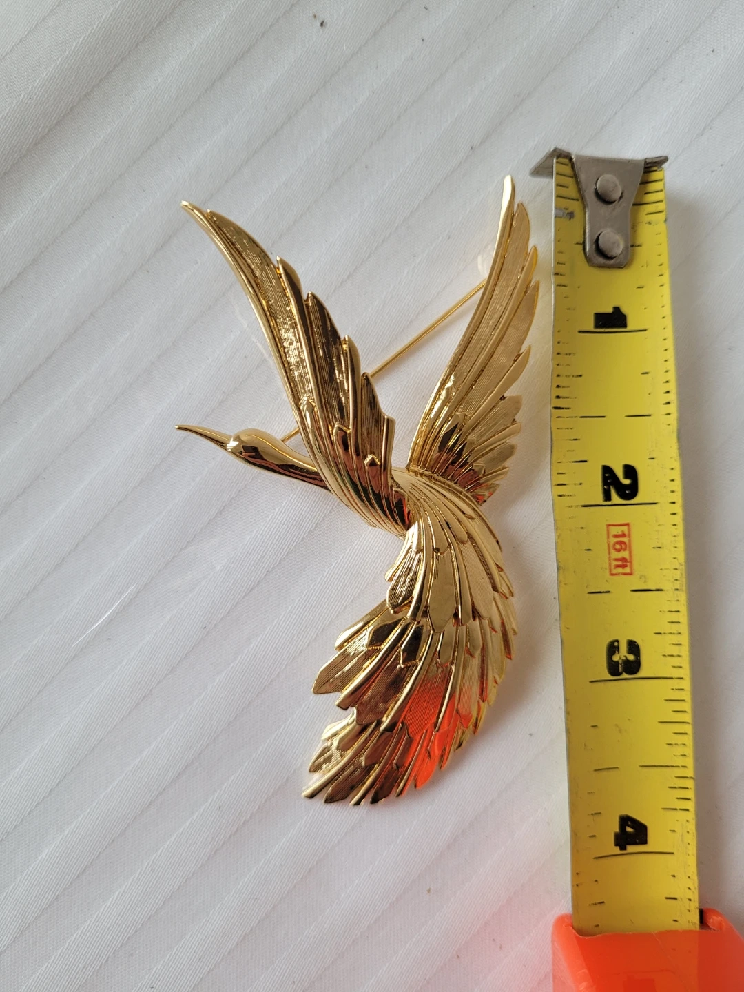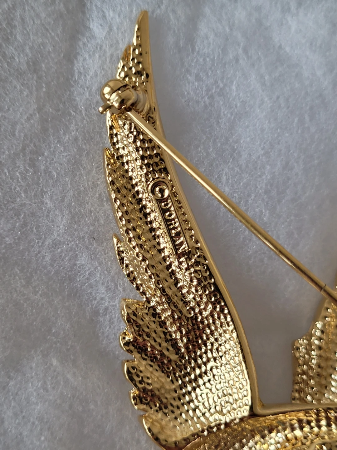 This is a beautiful gold-tone brooch designed as a bird in flight. It's crafted with intricate detailing on the feathers. It's a lovely accessory to add some flair to an outfit!