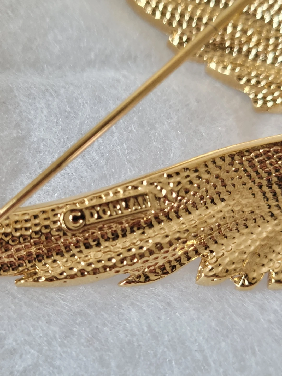 This is a striking gold-tone hummingbird brooch by DORLAN. It's signed on the back. It's a detailed piece with a textured finish on its wings. The pin measures approximately 3 inches in length.