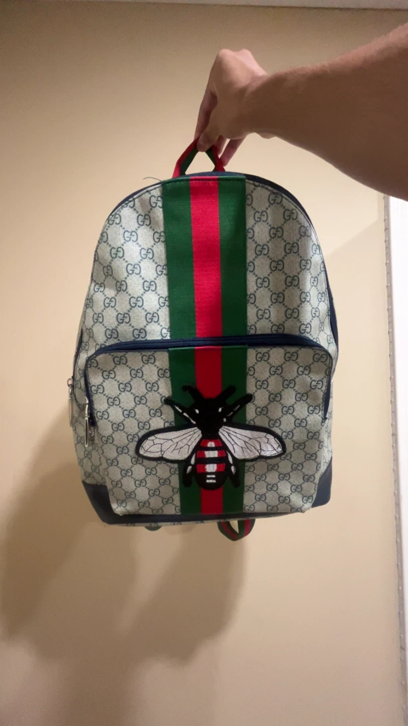 19This Gucci backpack features the iconic GG pattern and a distinctive bee appliqué The bag has red and green stripe detailing and navy blue accents