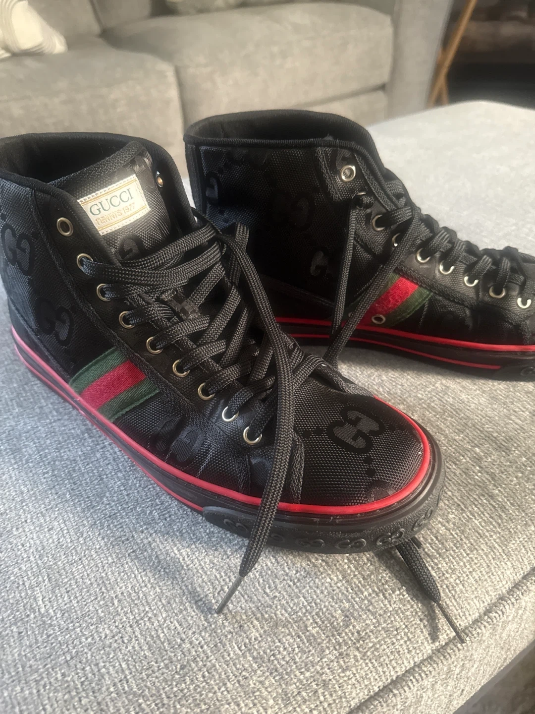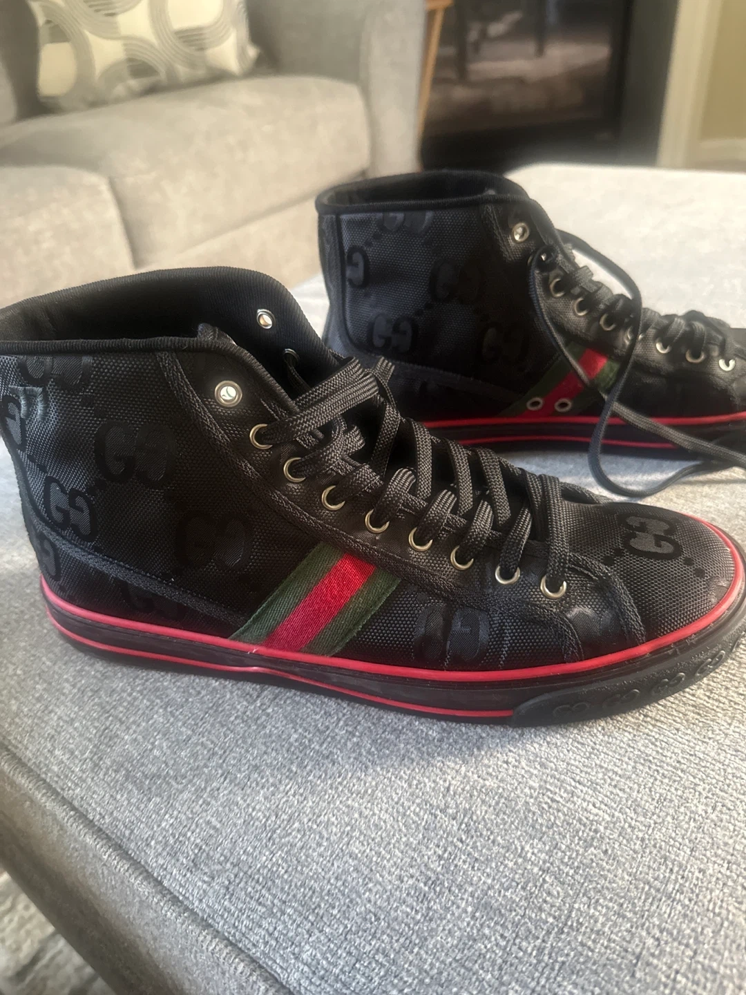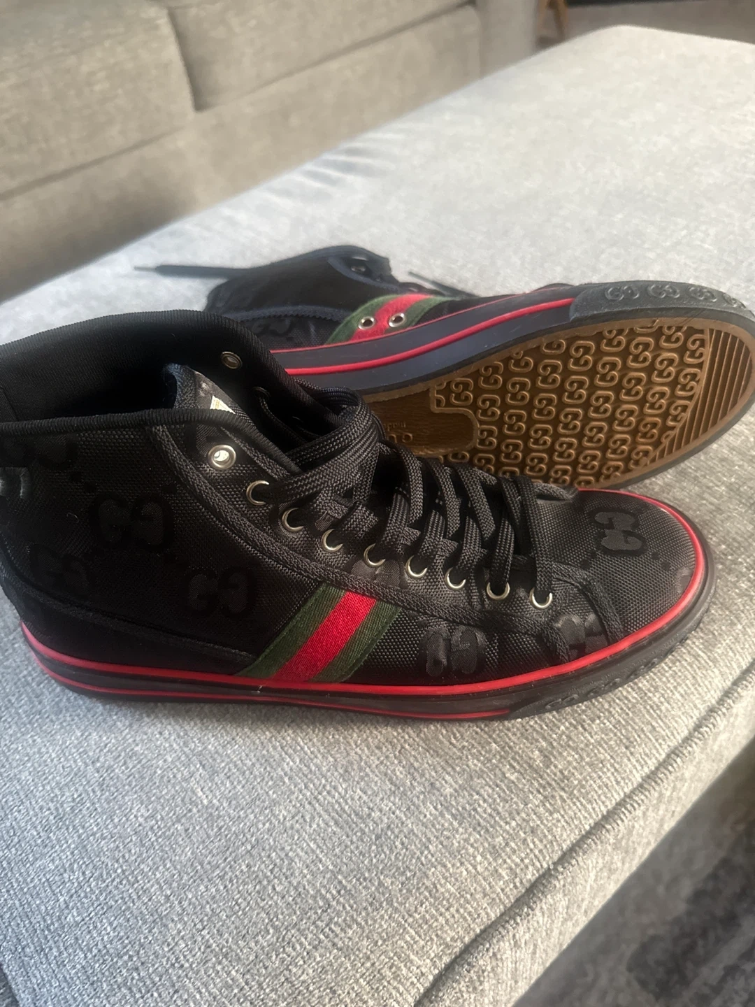 151Selling a pair of Gucci high-top sneakers. They're black with the Gucci logo pattern and the classic green and red stripe detail. Great for adding a touch of luxury to your everyday look I wore twice but it’s a bit narrow and squeeze my toes that’s the only reason for selling they 100% authentic I still have the box and receipt no low ballers plz.