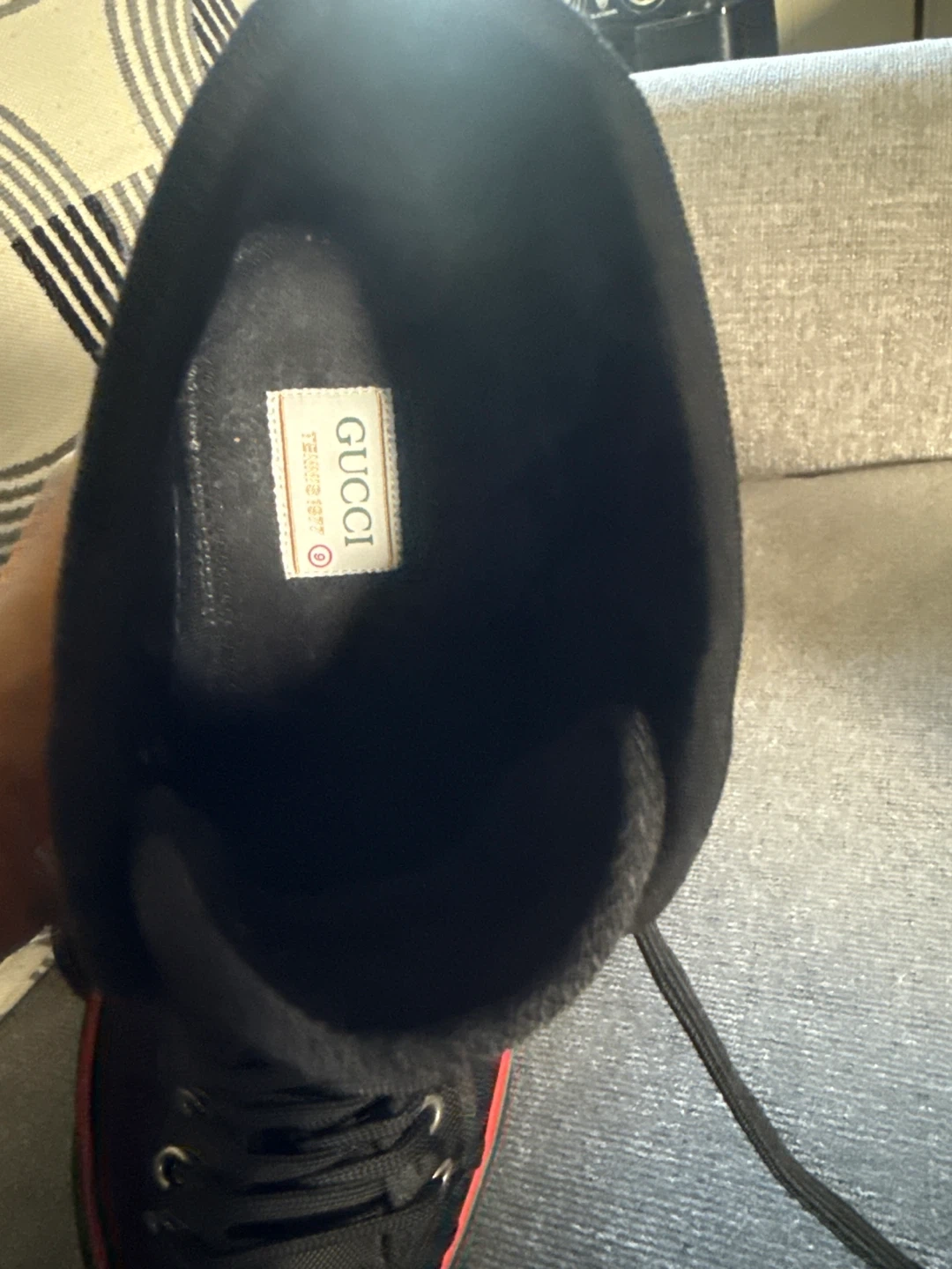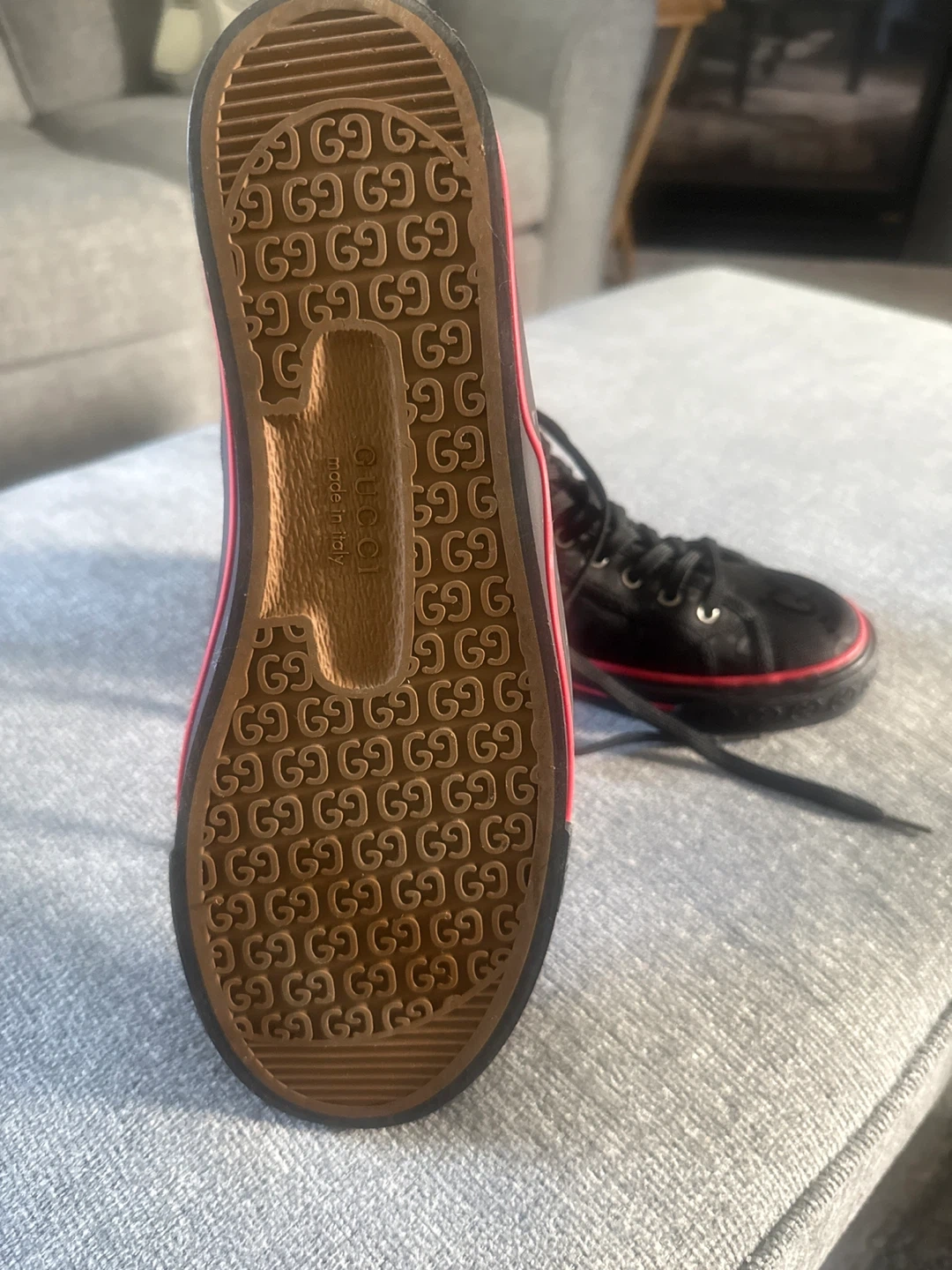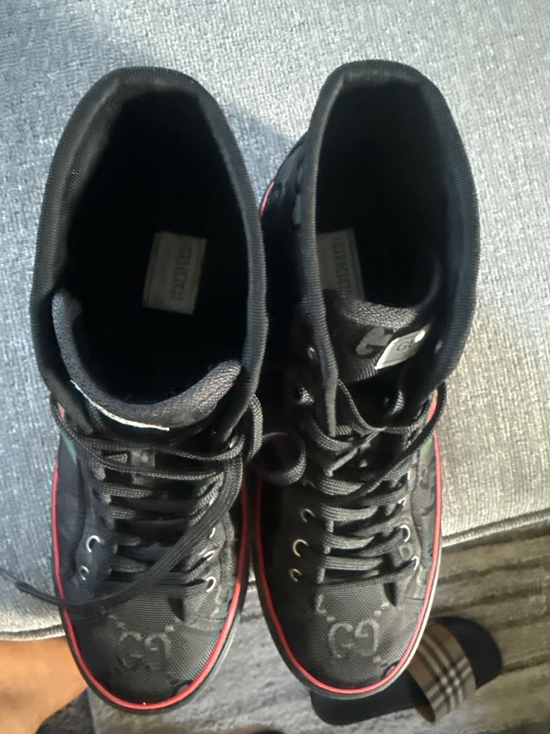 151Selling a pair of Gucci high-top sneakers. They're black with the Gucci logo pattern and the classic green and red stripe detail. Great for adding a touch of luxury to your everyday look I wore twice but it’s a bit narrow and squeeze my toes that’s the only reason for selling they 100% authentic I still have the box and receipt no low ballers plz.