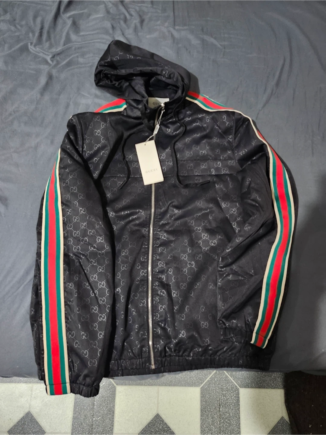 Selling a Gucci black jacket that features the brand's iconic GG pattern. It also has red and green stripes on the sleeves. It's in great condition! Tag says 3xl but fits on me and i’m like L-Xl . Got as a gift from my uncle. Send offers because i need to sell it asap as im moving.