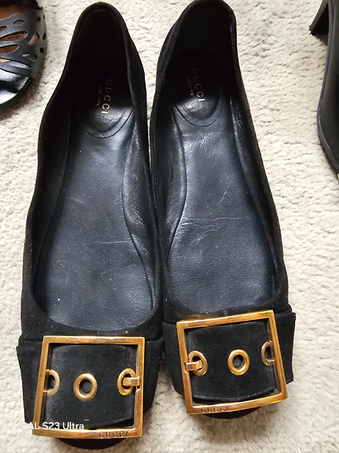 10Selling a pair of Gucci black suede flats. They feature a stylish gold buckle detail. These flats are perfect for adding a touch of elegance to any outfit!