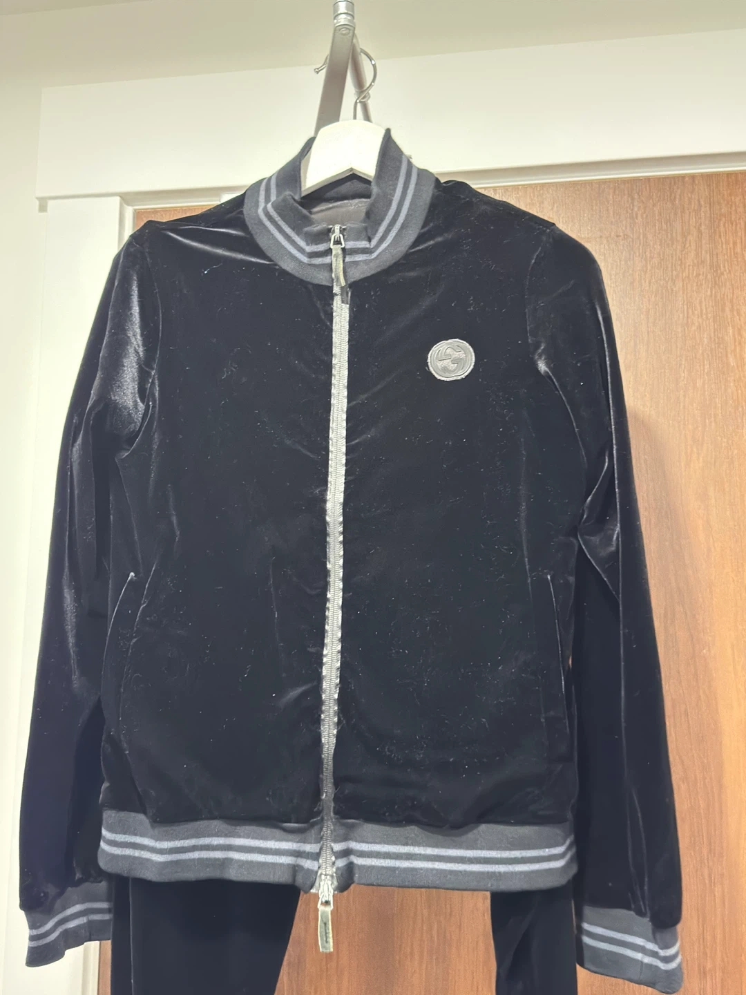 270Selling a stylish Uni sex Gucci tracksuit made from soft black velvet. The set includes both the jacket and pants. Perfect for adding a touch of luxury to your casual wear!